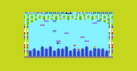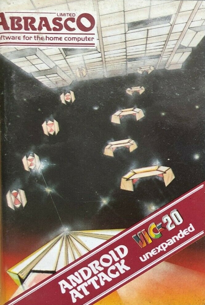 Android Attack is a 1-player arcade game for the VIC-20. You must defend your city from android attack. The player's ship can rotate left and right, and move and fire forwards. allowing up to 5 missiles on the screen at a time. Enemy androids move about at the top of the screen, and bombs drop towards the ground below. The goal is to shoot and destroy these dangers before they reach and demolish the city at the bottom of the screen. Retreating androids may drop bombs, and an android that reaches the city causes an indestructible bomb to be dropped from the android's giant star cruiser. The game is over when all buildings are destroyed. The player starts with 3 ships, and a new ship is awarded every 10,000 points.