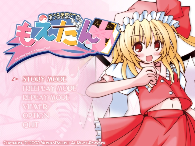 Moedan (萌える弾幕STG もえだん Moeru Danmaku STG Moedan, literally "Cute Curtain Fire Shooting Game, Moedan") is a practice/training shmup made by D.N.A.Softwares. It features some of the cast of the Touhou series (Flandre Scarlet, Alice Margatroid). It also features characters from another series, Moetan[1], a series of books which teaches Japanese people to say incredibly silly and useless things in English. The engine, naturally, bears a lot of similarities to the standard Touhou engine (including graze, shift key to move slower, visible hit box when slow, etc.)