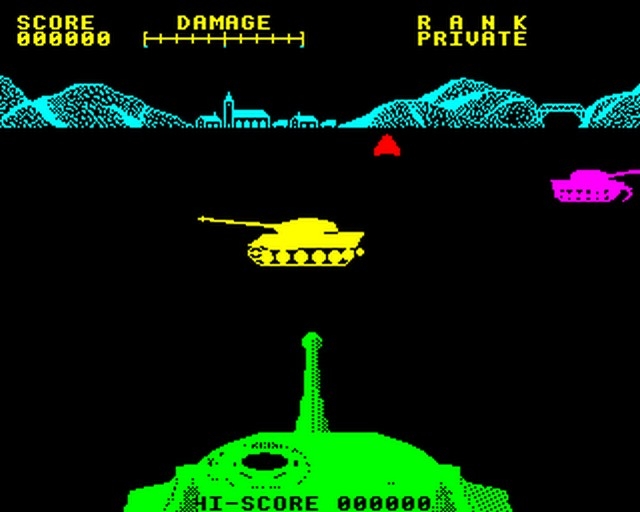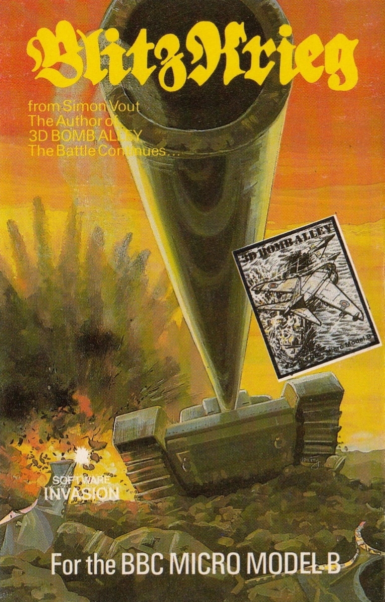 Blitzkrieg is a tank battle game released by Software Invasion for both the BBC Microcomputer and Acorn Electron. Your gun turret is a fixed view at the bottom - the turret also recoils realistically when fired. On moving right and left, the landscape in the distance, which is at the top of the screen, scrolls to simulate the view from your cockpit. In the mid-view are the other enemy tanks which are you combatants in this game. They appear at various distances and move in real time, in a manner relative to the landscape, whether you are scrolling it or not. If they stop and turn towards you, you need move quickly if you want to avoid their deadly shells. Shells that you fire take longer to reach more distant tanks and the sound of them blowing up is also diminished with extra distance. A tank that is more distant scores more, also as your score progresses, you get promoted to increasing military ranks.