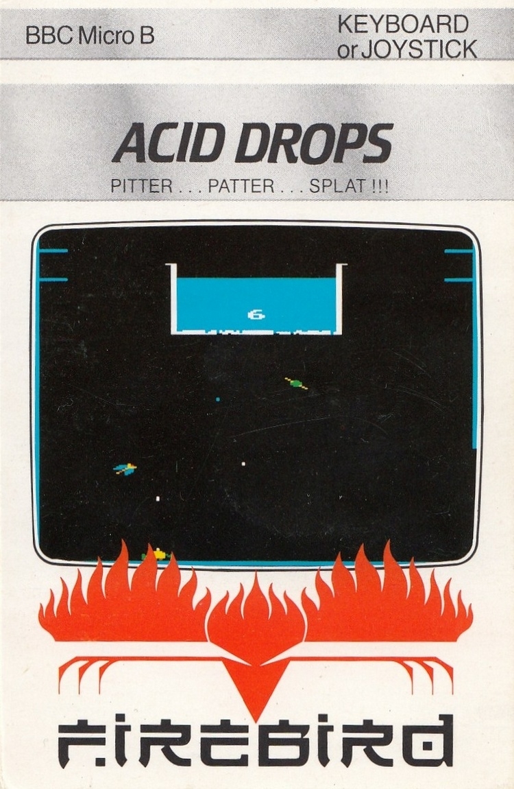 Acid Drops was programmed by Mike Granby. You have to shoot the aliens who are flying around the screen, two at a time, but watch out for the acid tank which is right above your ship. If you shoot a hole in the acid tank, the acid drips down, and contact with it is fatal. This makes accuracy important.