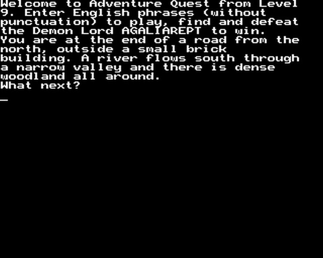 The sequel to Colossal Adventure is an interactive fiction game with a VERB NOUN interface. The fantasy setting takes a clear influence from Lord of the Rings. After centuries of harmony, Middle Earth has hit problems due to a cataclysmic sequence of events - a crop failure leading to animals turning violent, and then an attack from a mysterious enemy to the north. The evil Demon Lord Alagiarept is discovered to be responsible, and as such the Wizards are given a week to beat him, before Middle Earth must surrender. You play a rookie magician with Meditation, Mysticism and Moneymaking skills. While the main war goes on, you attempt a much bolder mission - locate the four Stones-of-the-Elements and the Medallion of Life to enter Alagiarept's Dark Tower and kill him. Your quest will take you through Beaches, Moors and Rocky Outcrops, as well as more specific locations such as the Pillar in the Desert, the Cave of the Sun-Dial and the Mills of God. Wolves, skeletal hands, sharks and octopuses must be dealt with.