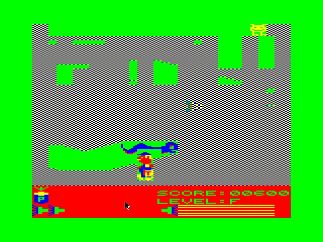 This game is very likely to drive you crazy. Your job is to paint the screen using your paintbrush and a few buckets of paint. Once your brush runs dry you will have to open a new bucket of paint and keep going. To make your job worse, various characters appear walking across your freshly painted surface leaving ugly footprints in their path. You have to cover those with more paint. Some of these characters can be killed by painting them, others will kill you. The game starts in a relatively easy-going style at level A but quickly pick up pace as you progress through the levels. Level H is completely insane with all kinds of characters popping out to ruin your paint, everything moving at a frantic speed, and even the music playing so fast that it alone can drive anyone crazy. It is possible to start the game at any of the levels.