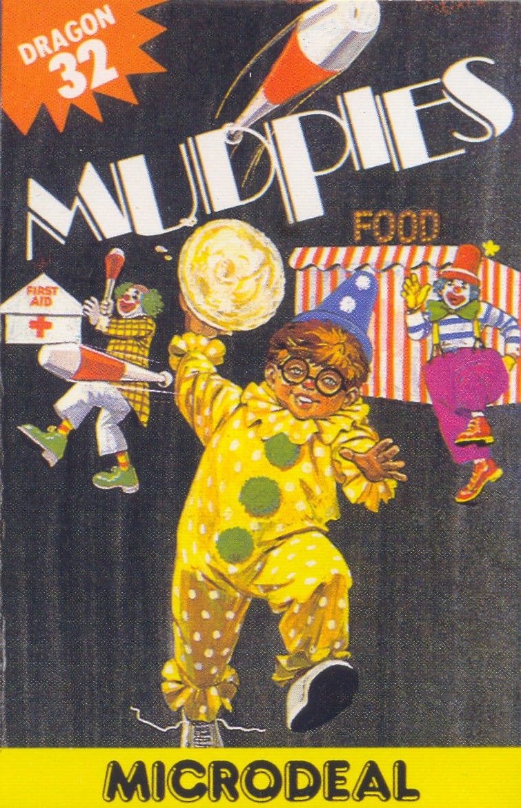 Mudpies is best described as a single screen, overhead, arcade shooter played for high scores. Similar in style to Robotron the player takes control of Arnold, a young boy who has disrupted a circus by throwing pies at the clowns. The clowns however are not happy and soon they begin throwing things back. By controlling Arnold, the player must navigate around the play area avoiding angry clowns and hitting them with pies to collect points. Clowns will attack by throwing juggling clubs and if hit by a clown or club will be sent to the First Aid tend and loose a life. Three trips to First Aid and it's game over (extra visits awarded for each 10,000 points scored). Arnold also has a food meter to keep an eye on which must be replenished to keep him moving. Picking up burgers, fries and shakes are just what he needs but overfeeding is just as bad as under feeding however and if the meter gets too low or high he will slow to half speed. There are six main rooms in the game which can be left when the doors become open, some rooms are Random Challenge rooms and have no pies to pick up for ammunition. If you can get out without getting caught you are awarded big bonus points. Also, after every 20,000 points you can exit into the Mudslinging Round, here the clowns are stationary and do not attack but are still deadly if ran into. The game has support for two players with play alternating between each life lost.