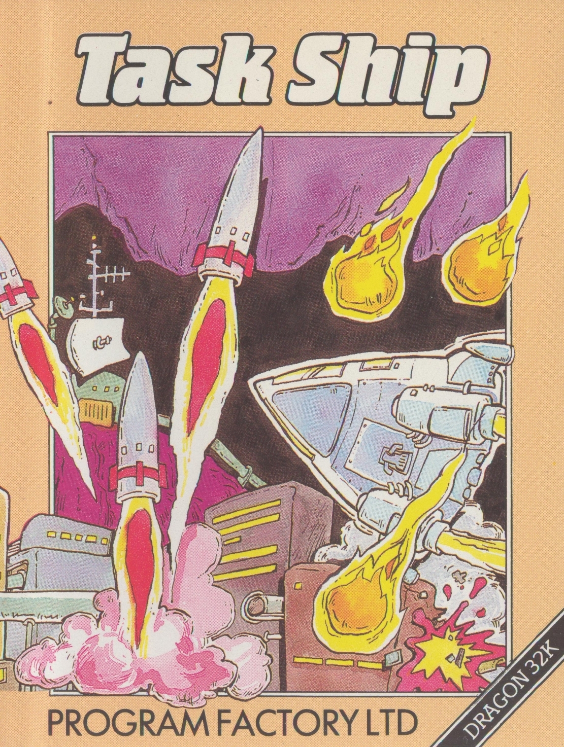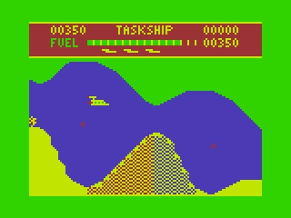 Taskship is a 1–2 player arcade game for the Dragon 32/64. The player controls a spaceship that moves in all directions as scenery tracks from the right of the screen. The ship can drop bombs on enemy infrastructure and fire a laser beam straight ahead. Enemy vessels, comets, and rocket launchers pose dangers to the player, as the player navigates cityscapes, underground tunnels, and other dangers. The player has limited fuel, and can pick up more by destroying enemy fuel depots. The player starts with four lives. The program includes a scenario editor that allows the player to make and play their own levels by altering terrain and placing enemies. Scenarios can be saved for later use. Groups +