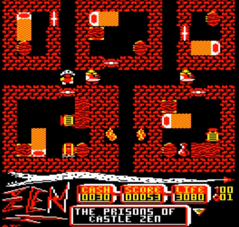 Zen is a huge arcade adventure game for the BBC micro with a disc drive. It was originally written in 1987 but not properly finished until the summer of 2012. You have been wrongly imprisoned by Zen and must find a way to escape from his kingdom, a very difficult and dangerous task. On your way you will encounter various objects and monsters. Developers Andrew Cook