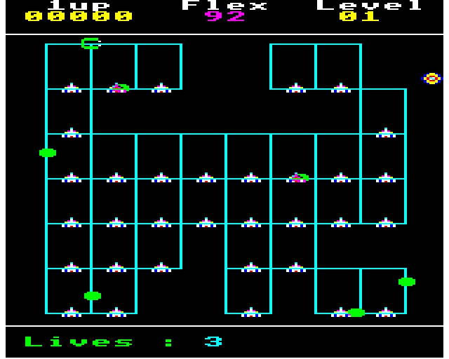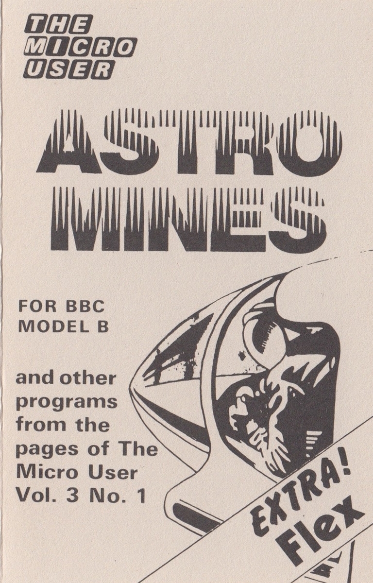 You are the captain of the starship Galaxy Hopper and your mission is to search the galaxy for planets suitable for mining. You must clear each galaxy before you are destroyed by aliens or you run out of fuel. This game featured on the Micro User cassette 3.01 of March 1985. A bonus game called Flex, written by Jonathan Stuart, was included on the tape.