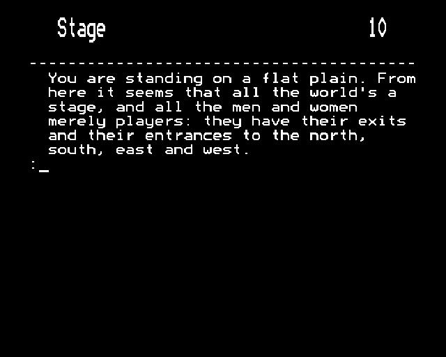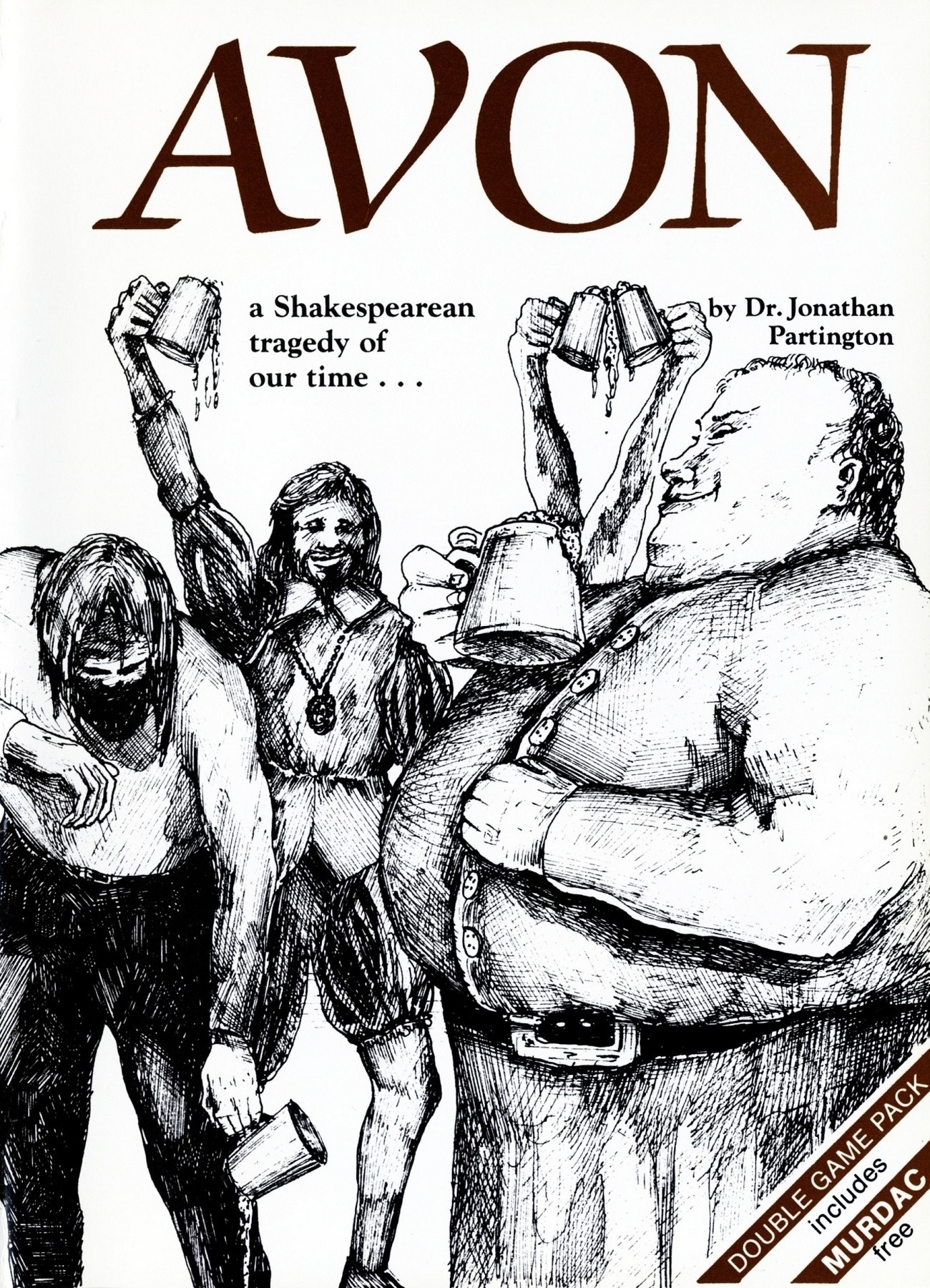 A double-pack of games originally written for the Phoenix IBM System/370 mainframe at Cambridge University, reworked for commercial release on home computers: Avon is a Shakespearean adventure which begins with a sight-seeing visit to the playwright's hometown. As the protagonist explores the streets and souvenir shops, certain people, animals and objects begin exhibiting strange behavior; finally, the surroundings become completely unfamiliar, and the inhabitants' English unusually rich and poetic. the stage is set for an exploration of this strange land, in an attempt to find a way out. The happenings take place over three different calendar dates; the game world is a blend of places and characters from Shakespeare's plays. Monsters of Murdac is billed as a bonus game, in which an expatriate known only as George takes a flight from England back to his native land of Murdac. Here he meets a mysterious old lady remembered from his childhood, rumored to be a witch. A stop at her strangely-furnished home proves fateful, as the hero finds himself sent on a quest deep into the foreboding forest of Murdac.