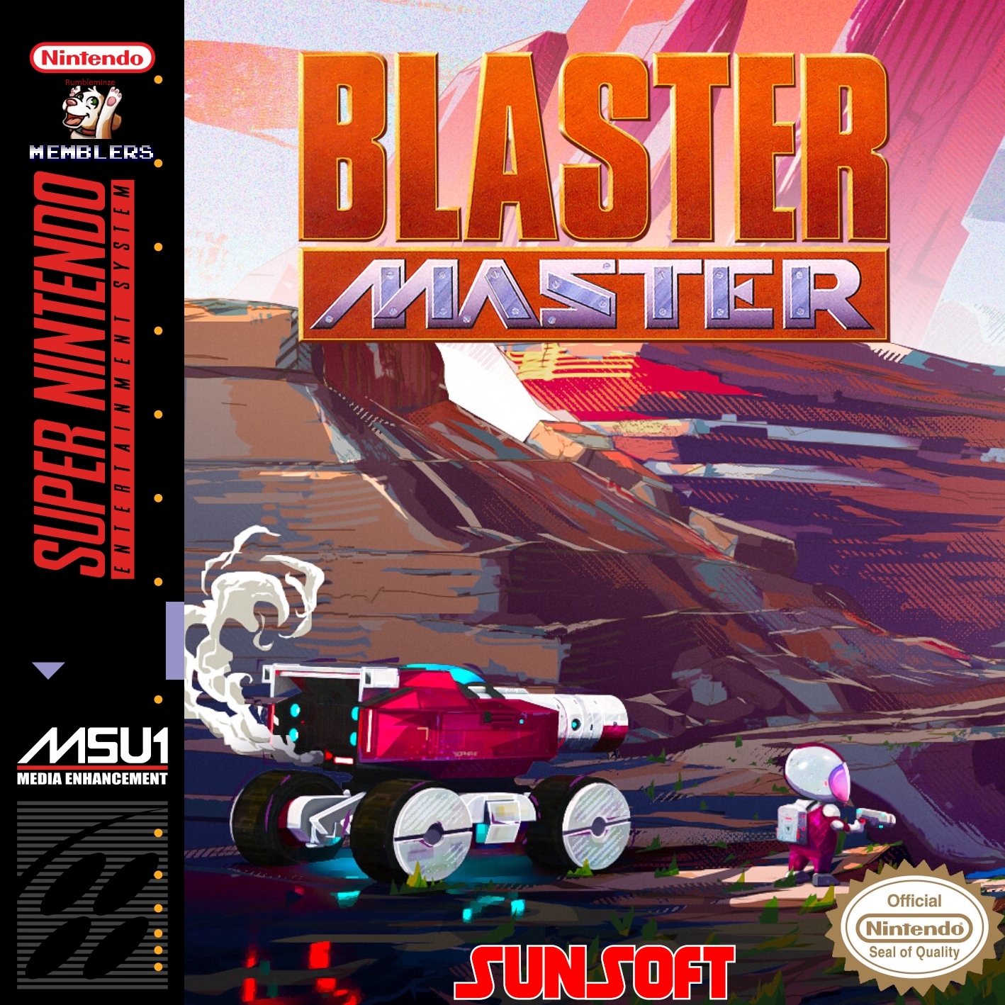 1:1 port of the NES version of Blaster Master, running on the SNES. It is utilizing FastROM/HiROM. This has been tested in Mesen2, MiSTer, on original hardware via FxPak Pro, as well as a physical cart using a MouseBite Labs board. Additional Features -------------------- MSU-1 Audio music is supported. If your platform supports MSU-1 Audio, there is an included pack available. You can press SELECT on the options screen to preview all the MSU-1 tracks and individually turn them off, if you prefer the 2A03 music. The "X" button will act as if you pressed both Down and Y, which will fire your selected special weapon while in the tank. The "R" button will mirror the NES "A" button (the SNES B button), which shoots grenades and jumps. This allows you to hold R to strafe in the overhead levels. The "L" button will temporarily disable Wall.2 for the purposes of climbing down the corner of a wall. This allows you to more easily jump off ledges rather than accidently clinging to the wall and falling to your death. Additionally, the following Quality of Life options are available: 1. Choice of two palettes, the default Mesen2 NES palette, or the default FCEUX palette 2. Turn on hover recharge while idle - this will slowly fill your hover gauge as long as you're on the ground not moving. 3. Gun Degrade - FULL (1 bar lost per hit), or 1/4 (lose at 1/4 the rate, although the first hit will drop you down a level) 4. Continues - either unlimited or the original limit of 4 5. Lives - either unlimited or the original limit of 3 6. Saving - The game will automatically save periodically, including when you reach a new area or pick up a key item. You can choose to load this save when you start the game, which will start you at the beginning of the area you were in, with your items, lives, continues, and sub weapon counts in tact. You can also choose to change any of the QoL options when you load your save.