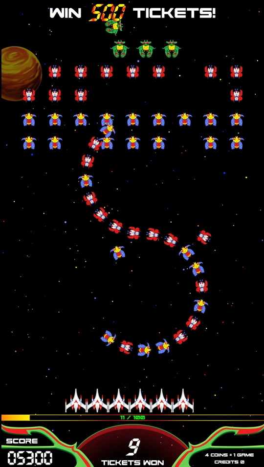 For those who have been Galaga fans for Decades and for the ticket redemption rookies who may be playing Galaga for the first time, Bandai Namco and Raw Thrills have joined forces again to present GALAGA ASSAULT. Destroy a wave of enemy ships for a chance to defeat the mothership and win the bonus! Galaga Assault has an all new "add ships" feature that allows the player to buy more ships and expand to an armada of up to 12 attacking ships.