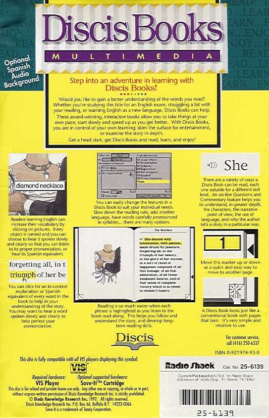 Read... Learn... Enjoy. Step into an adventure in learning with Discis Books! Would you like to gain a better understanding of the words you read? Whether you're studying this title for an English exam, struggling a bit with your reading, or learning English as a new language, Discis Books can help. There award-winning, interactive books allow you to take things at your own pace; start slowly and speed up as you get better. With Discis Books, you are in control of your own learning; skim the surface for entertainment, or examine the story in depth. Get a head start, get Discis Books and read, learn, and enjoy! Readers learning English can increase their vocabulary by clicking on pictures. Every object is named and you can choose to hear it spoken slowly and clearly so that you can listen to its proper pronunciation, or hear its Spanish equivalent. You can click for an in-context explanation or Spanish equivalent of every word in the book to help in your understanding of the story. You may want to hear a word spoken slowly and clearly to help perfect your pronunciation. You can easily change the features in a Discis Book to suit your individual needs. Slow down the reading rate, add another language, have words carefully pronounced in syllables... there are many options. Reading is so much easier when each phrase is highlighted as you listen to the book read along. This helps you follow and understand the story, and develop long-term reading skills. There are a variety of ways a Discis Book can be read, each one suitable for a different skill level. An on-line Questions and Commentary feature helps you to understand, in greater depth, the characters, the narrative point of view, the use of language, and why the author tells a story in a particular way. Move a marker up or down as a quick and easy way to move to another page. A Discis Book looks just like a conventional book with pages that turn. It's very simple and intuitive to use. Optional Spanish audio background. The Necklace, by Guy Maupassant.