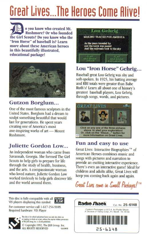 Interactive Biographies of American Heroes Volume 1. Great lives... The Heroes come alive! Do you know who created Mt. Rushmore? Or who founded the Girl Scouts? Do you know who the "Iron Horse" of baseball is? Learn more about these American heroes in this beautifully illustrated, educational package! Lou "Iron Horse" Gehrig... Baseball great Lou Gehrig was shy and soft-spoken. In 1925, his batting average and RBI totals were greater than Babe Ruth's! Learn about one of history's greatest baseball players, Lou Gehrig, through songs, words, and pictures. Gutzon Borglum... One of the most famous sculptures in the United States. Borglum had a dream to sculpt something beautiful that would last for generations. He spent years creating one of America's most awe-inspiring works of art- Mount Rushmore. Juliette Gordon Low... An independent woman who came from Savannah, Georgia. She formed the Girl Scouts to help girls prepare for life through the study of health, business, and the arts. A compassionate woman who loved nature, Juliette Gordon Low worked tirelessly to help girls discover life and the world around them. Fun and easy to use. Great Lives: Interactive Biographies of American Heroes combines music and songs with pictures and narration to provide an exciting interactive experience. There's even an interactive game! Ideal for children and adults alike, Great Lives will keep you coming back again and again.