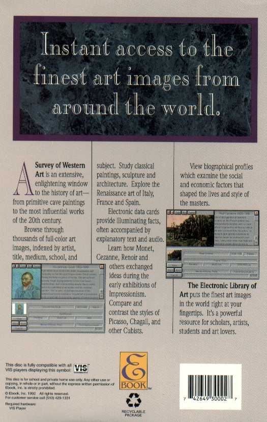 A Survey of Western Art is an extensive, enlightening window to the history of art- from primitive cave paintings to the most influential works of the 20th century. Browse through thousands of full color art images, indexed by artist, title, medium and school. Study classical paintings, sculpture and architecture. Explore the Renaissance art of Italy, France, and Spain. Electronic data cards provide illuminating facts, often accompanied by explanatory text and audio. Learn how Monet, Cezanne, Renoir and others exchanged ideas during the early exhibitions of Impressionism. Compare and contrast the styles of Picasso, Chagall, and other Cubists. View biographical profiles which examine the social and economic factors that shaped the lives and styles of the masters. The Electronic Library of Art puts the finest art images in the world right at your fingertips. It's a powerful resource for scholars, artists, students and art lovers.
