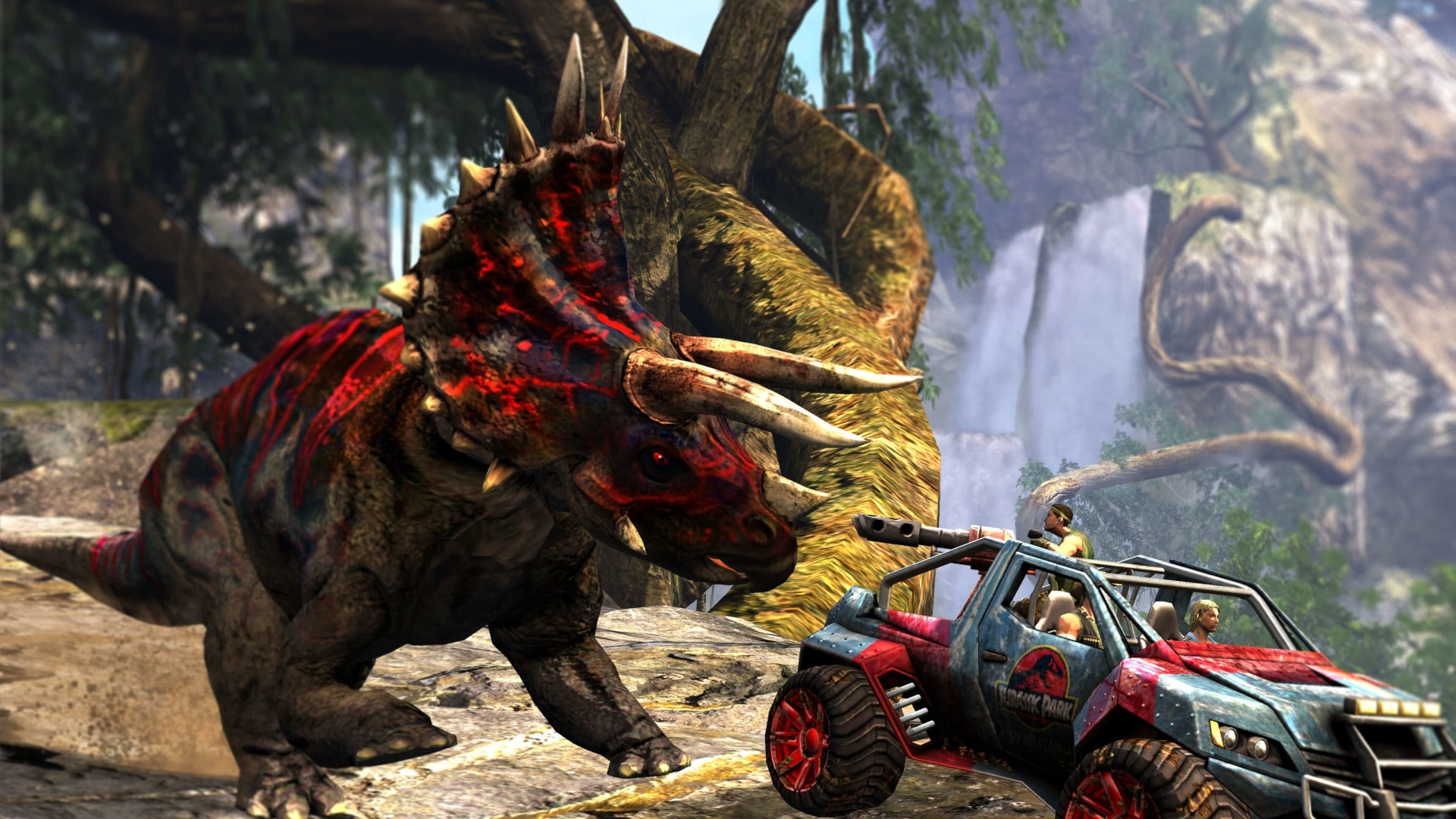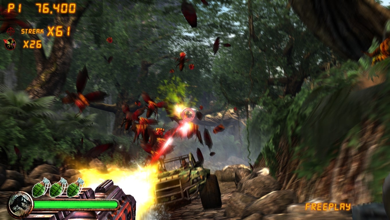 Jurassic Park: Arcade is a 3D lightgun shooter played from a first-person perspective based on the Jurassic Park franchise. A volcano has erupted on Isla Nublar leaving the island the park stands on unstable. The player is part of a team send to track down and capture several dinosaur species. The game offers a total of nine stages and three bosses: a Triceratops, Tyrannosaurus and Spinosaurus. While playing the player has to gun down over thirty different enemies. A total of five different weapons can be used while playing. These are the X-22 Renegade, Titan 2000, Shockbolt, Frostbite cannon and Triple Threat. The game can be played solo or with a friend.