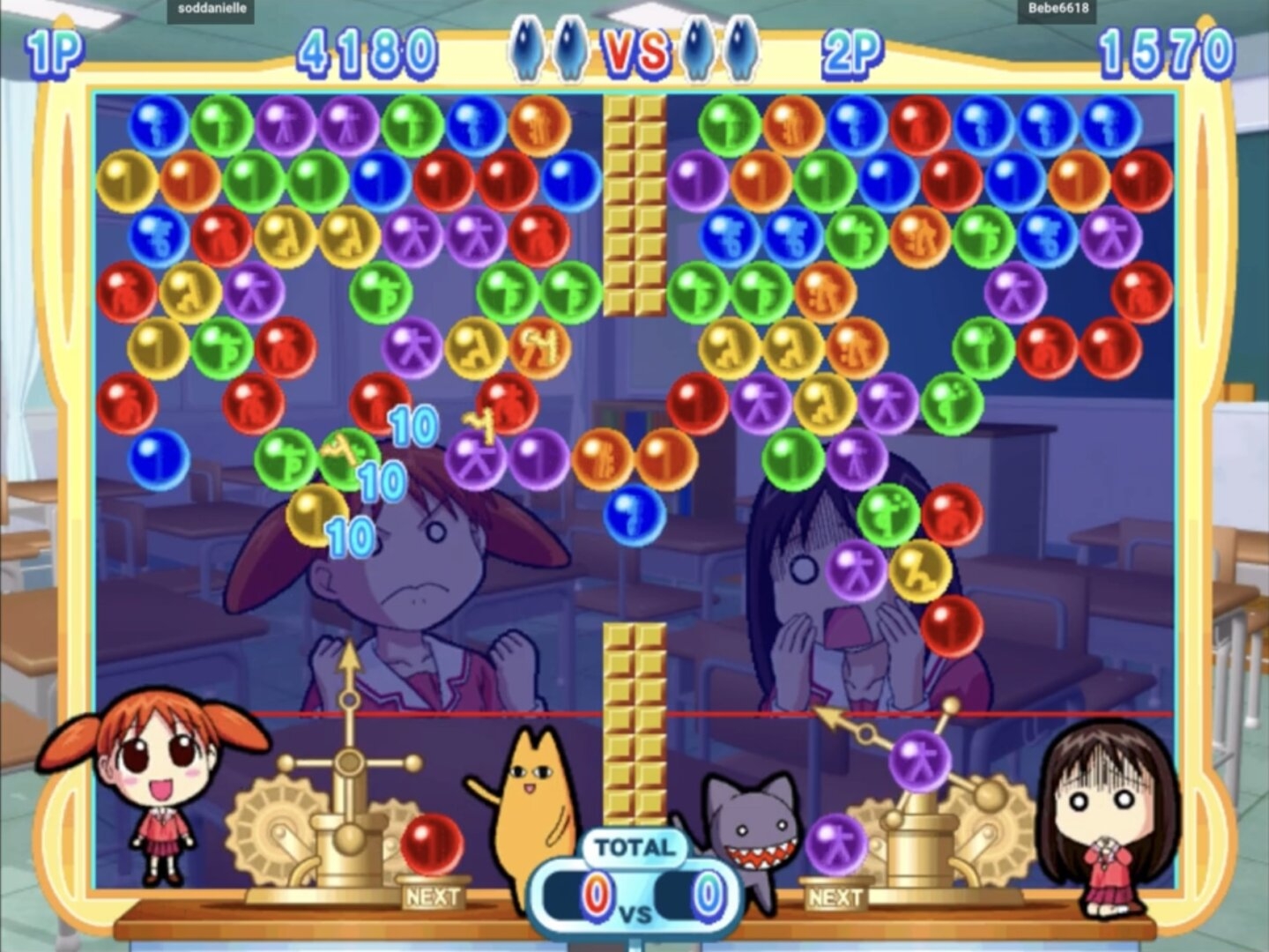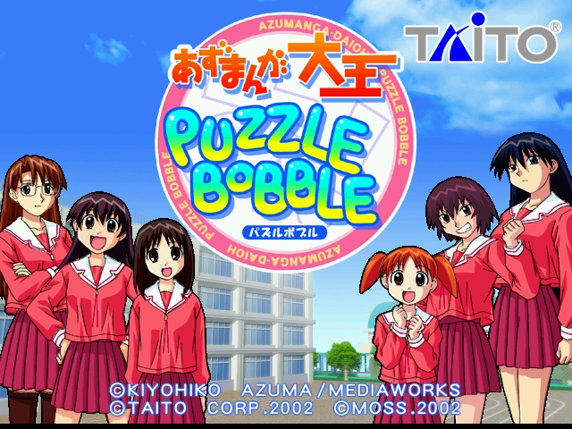 Azumanga Daioh Puzzle Bobble (あずまんが大王パズルボブル) is a Puzzle video game published by Taito released on 2002 for the Naomi Arcade platform. Azumanga Daioh Puzzle Bobble is a game based on the Azumanga Daioh anime and manga which was released by Taito Corporation as an arcade-only Puzzle Bobble spin-off on June 1, 2002. It was developed by MOSS for the Sega NAOMI GD-ROM arcade and distributed in Japan exclusively. It also has a two-player mode and the original voice actors from the Azumanga Daioh anime reprise their roles. It is controlled using one joystick and two buttons