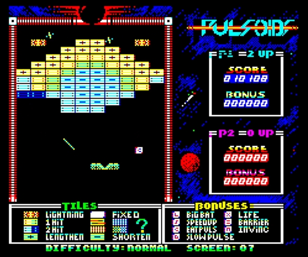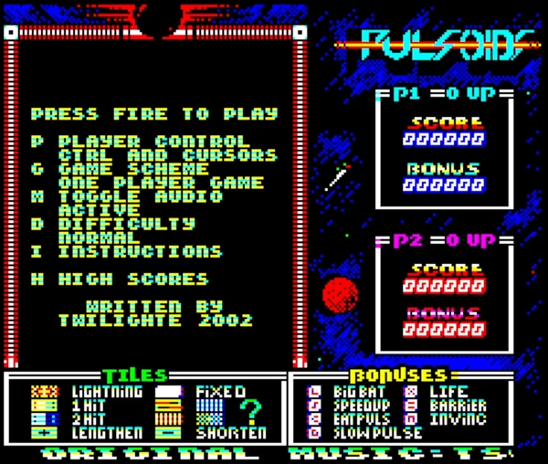 PULSOIDS is an arcade game for one or two players (Alternating). Each player must clear the screen of tiles by deflecting Pulsoids (Energy pulses) off their energy mirror (Bat). Each player starts with one Pulse. However, Aliens also play in this arena, entering from the eye at the top of the screen. If a Pulsoid collides with it, the alien will be destroyed and the Pulsoid will split into two. Bonuses also fall for some tiles that are destroyed. Collect them to earn extra power-ups and increase your score. The game was written by Jonathan 'Twilighte' Bristow, based on the Mastertronic game released for the Commodore 64, Amstrad CPC and ZX Spectrum machines. It was released simultaneously by both Club Europe Oric and Rhetoric.