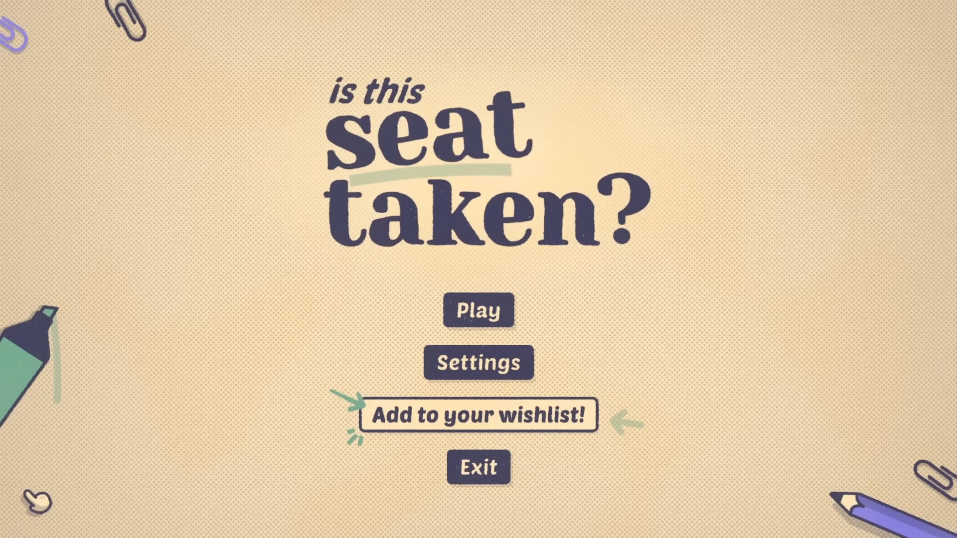 Is This Seat Taken? is a logic puzzle game set in a world of sentient shapes. Each level depicts a scenario in which the player must arrange these shapes until they all are satisfied with their position. Examples include shapes who wish to be seated next to a specific person, next to a window, or away from loud music.