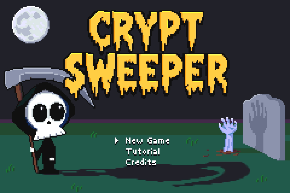 Crypt Sweeper is a brand new spooky puzzle game for the Game Boy Advance. Death has discovered a loophole in their contract: no humans means no job - and early retirement! Battle monsters strategically placed across a haunted graveyard, uncover enemy patterns, and and foil Death’s twisted plan to end humanity. The game blends the classic puzzle mechanics of Minesweeper with RPG-inspired progression. Players explore a tile-based graveyard, carefully revealing squares to identify hidden monsters. Defeating monsters earns experience points to level up, but strategic planning is crucial, as each encounter costs health points.
