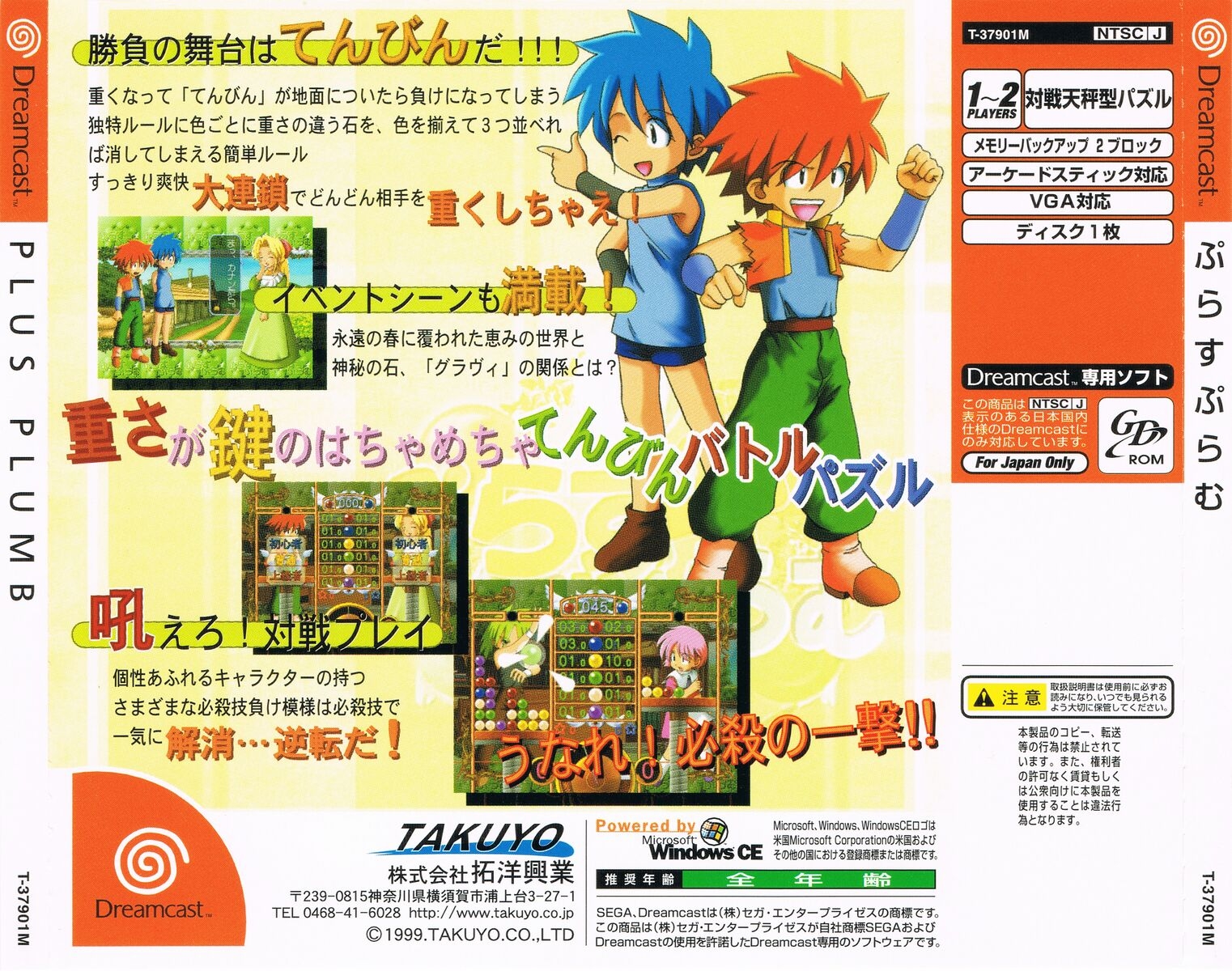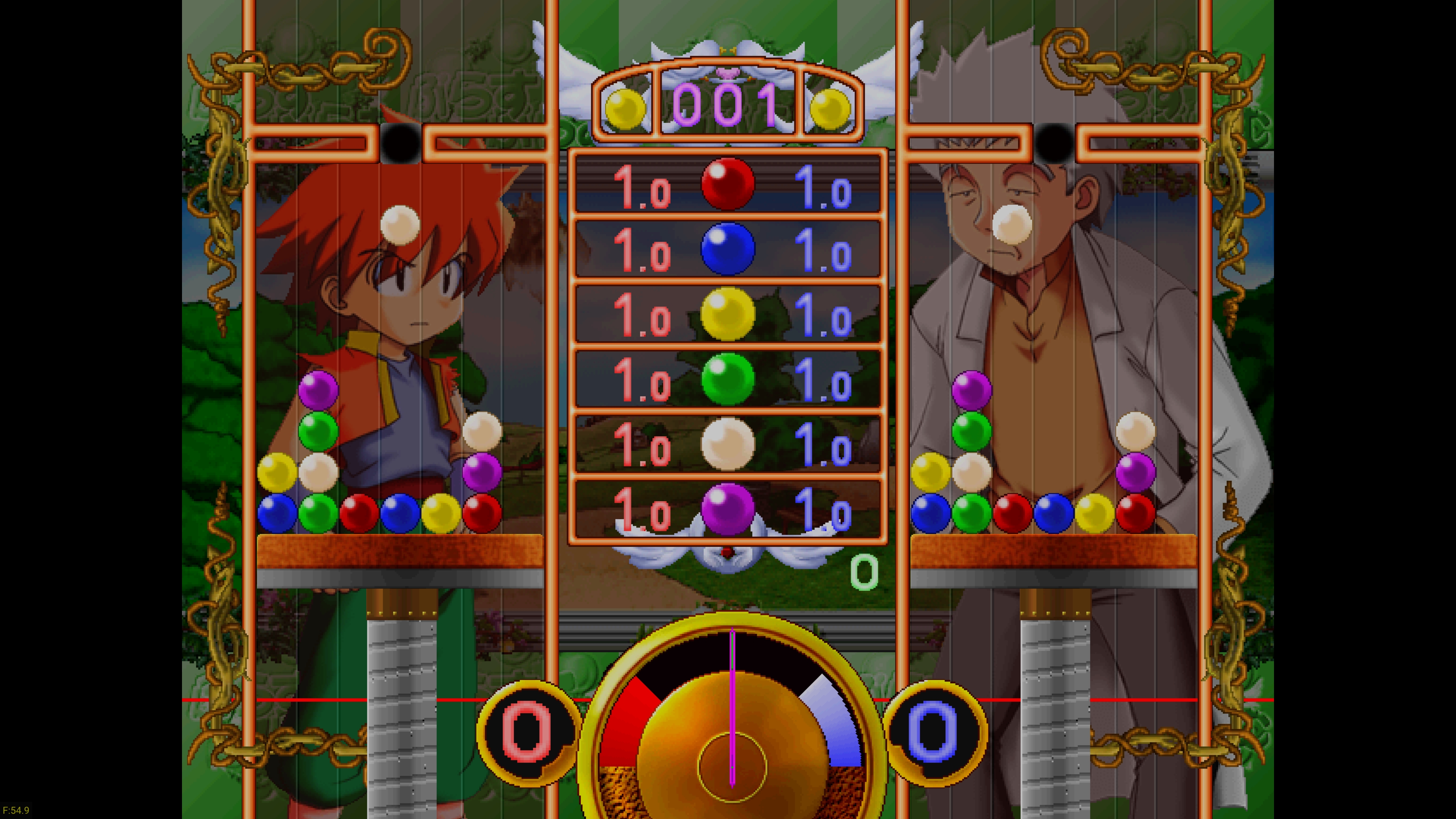 Plus Plum is an action puzzle game released in Japan in 1999 and published by Takuyo. Gameplay is similar to Tetris where red, blue, yellow, green, white, or purple spheres drop from the top of the screen one at a time and must be matched with similar colors in an adjacent row. The player places the spheres and that toggle in color as they fall from red to blue, yellow to green, or white to purple. If three or more spheres of similar color are dropped adjacent to one another, the line of spheres will disappear, and any spheres above will fall to next level. All spheres touching the line that disappears will switch to their alternate colors. The twist on the typical Tetris-gameplay is that the spheres fall onto a platform that can only hold so much weight before it gradually gives way under the strain of too many spheres and gets pushed to the bottom of the screen.