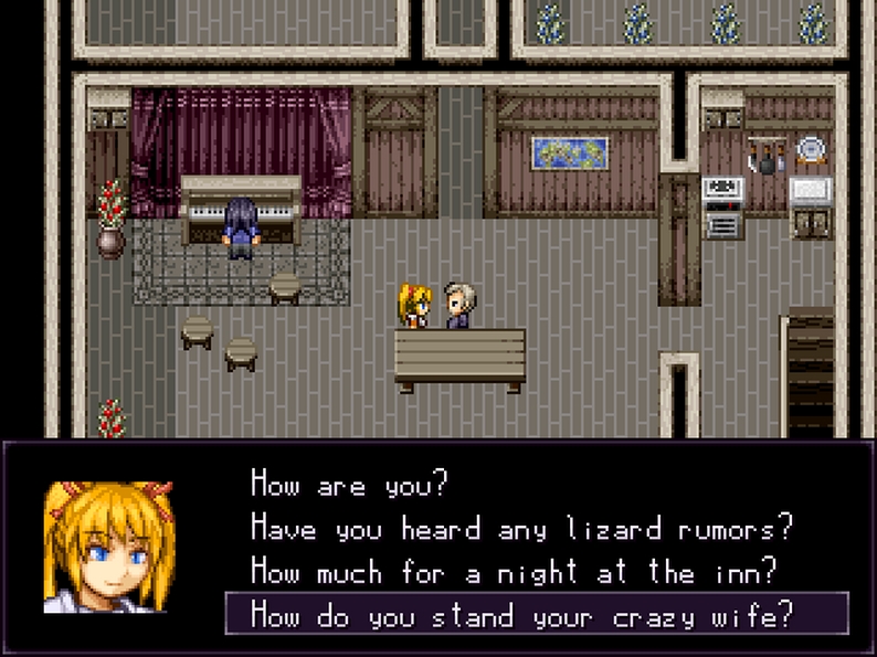 Chelsea is the princess of the (definitely real) kingdom of Lemuria. After journeying to the hamlet of Lunenberg and learning about the (definitely real) lizard terrorizing the local peasantry, she and her retinue take it upon themselves to end this menace for once and for all! Explore the town, talk to its inhabitants, unravel the plots of its various factions, complete menial errands, retrieve cut-rate treasure... This game's got it all!! (it's short, dumb, and moderately funny -- you should play it)