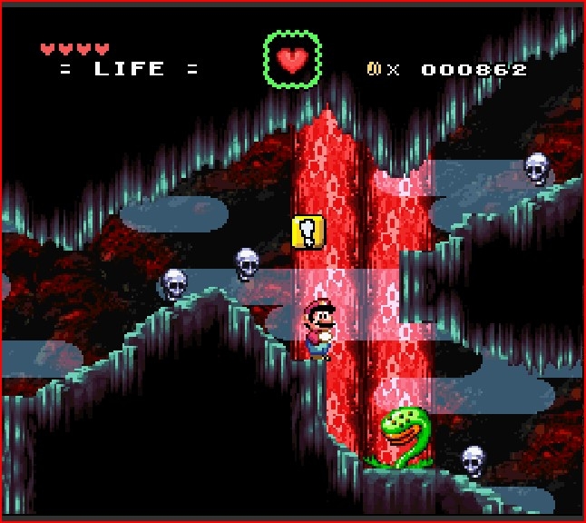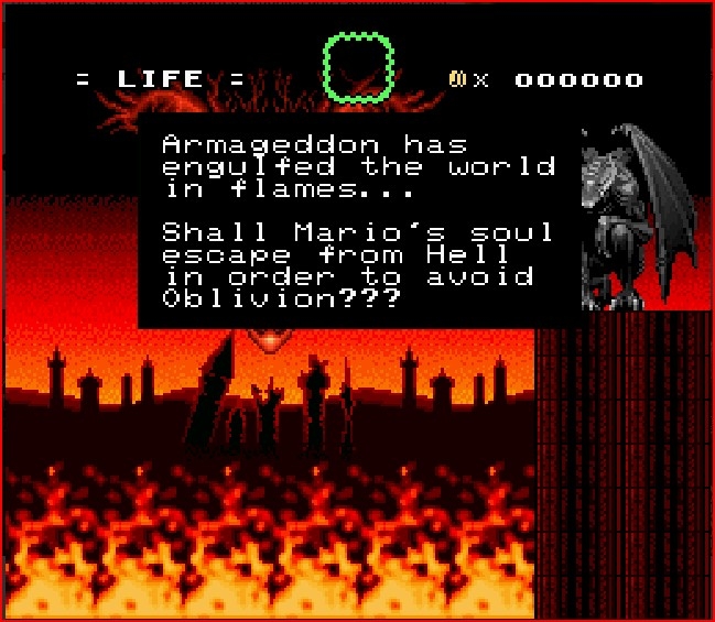 In this hack, the entire world has met destruction due to a cataclysmic event that I will not discuss, meaning that all life & existence is dead. How do you make a hack about Mario if he's dead? Well, simple. Mario's soul has to escape from Hell. I know, not a happy thought, but this hack aims to be as entertaining as possible. Only a couple levels are done, but they have content.... and by content I mean every screen in the game contains something fresh & new to keep the player amused. I only plan to have around 12 levels (1 world), so this hack is going to focus on the 'exploration' element. To beat this hack you will have to destroy Death, returning all that has passed away back to life. ~~Features~~ + Evil storyline + ExGFX & custom palettes + New sprites programmed by me + Sylish music + Cryptic level design + Fire power is back better than ever!