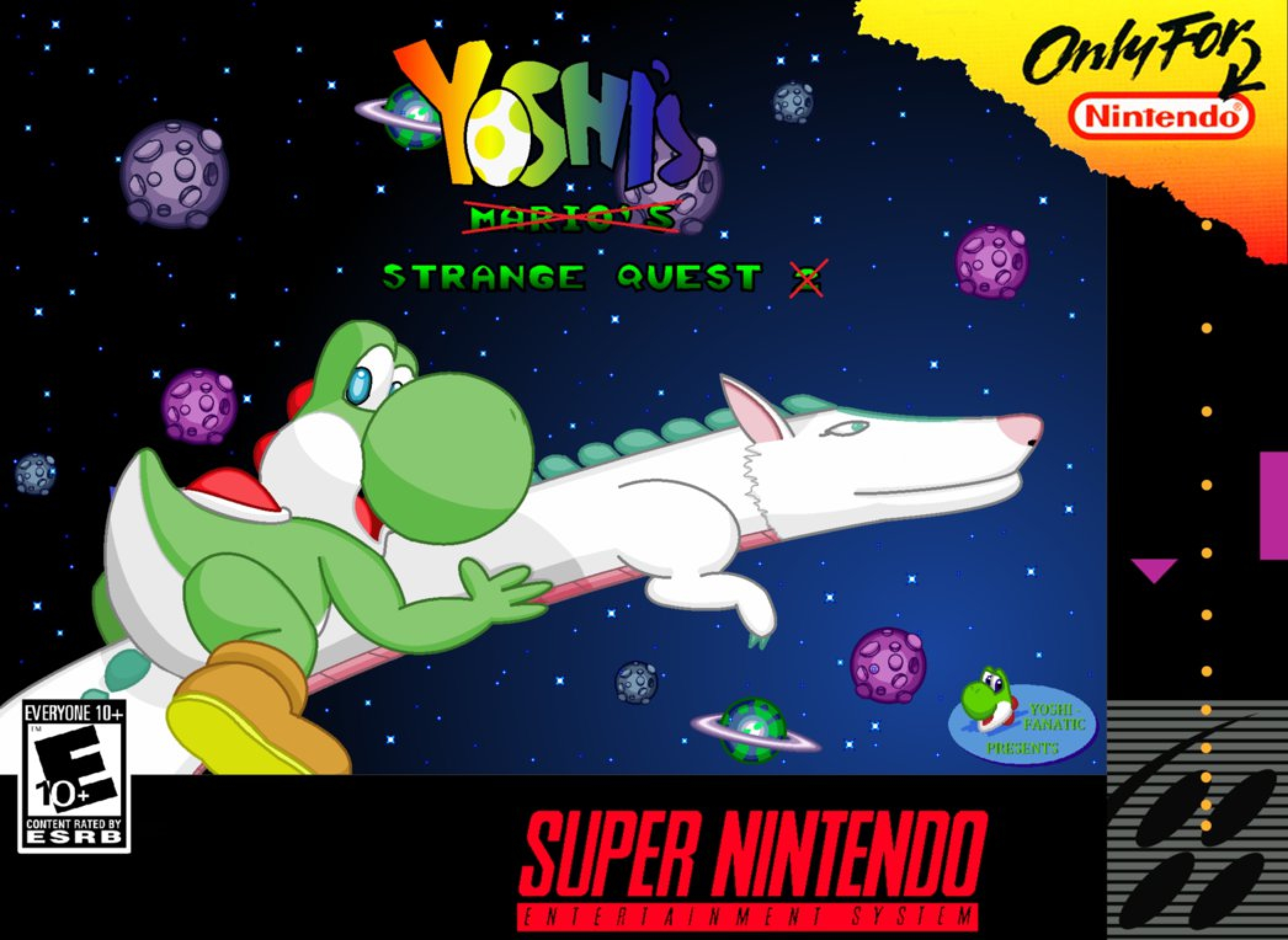 This is the sequel to Mario’s Strange Quest. Picking up where Mario’s Strange Quest left off, it turns out that the part where Yoshi’s eggs hatched at the end of MSQ didn’t actually happen. What really happened after Mario beat Bowser, rescued Yoshi’s eggs, and saved the princess was that Yoshi and his sleepy friend decided to move to a new land so that he can protect his eggs from Bowser before they really hatched. So, both Yoshis do so and they find themselves in the land of Weirdonia. However, it seems that Bowser apparently insists on stealing Yoshi’s eggs, since Yoshi’s eggs were stolen again while Yoshi was out shopping. Since Mario isn’t around to help this time, Yoshi goes on a quest by himself to retrieve his eggs. However, just like Mario’s Strange Quest, this isn’t your ordinary quest. The land of Weirdonia is a strange land filled with bizarre gimmicks, weird themes, and possibly jelly filled donuts and pizza. Expect the unexpected during Yoshi’s journey. This hack’s features: 71 levels (100 exits) Custom Graphics Tested on and works on a real SNES Custom Music Custom ASM Lots of level variety Plenty of (possibly) unique gimmicks and themes Lots of silliness and general weirdness A box art image, a cartridge sticker image, and a game manual (download links are in the readme) Older versions of YSQ (V1.0, V1.1, V1.2, and V1.3 Beta) are linked to in the readme for those that are interested in seeing what YSQ was like in past versions Lots of secrets to find Free novelty T-shirts with every download* T-shirt not included.