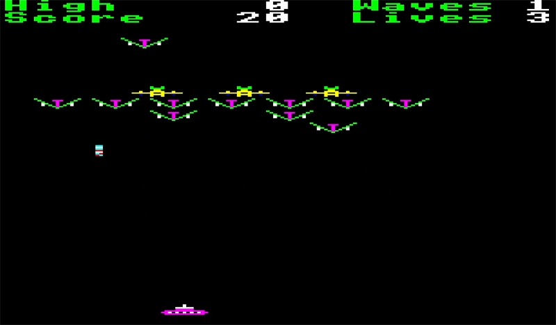 Spectacularly fast arcade style game. Options for different speed of game - even the slowest is fast! Many different screens and bonus scores. Graphics are really superb. Authors: Brian and Marian Clark.