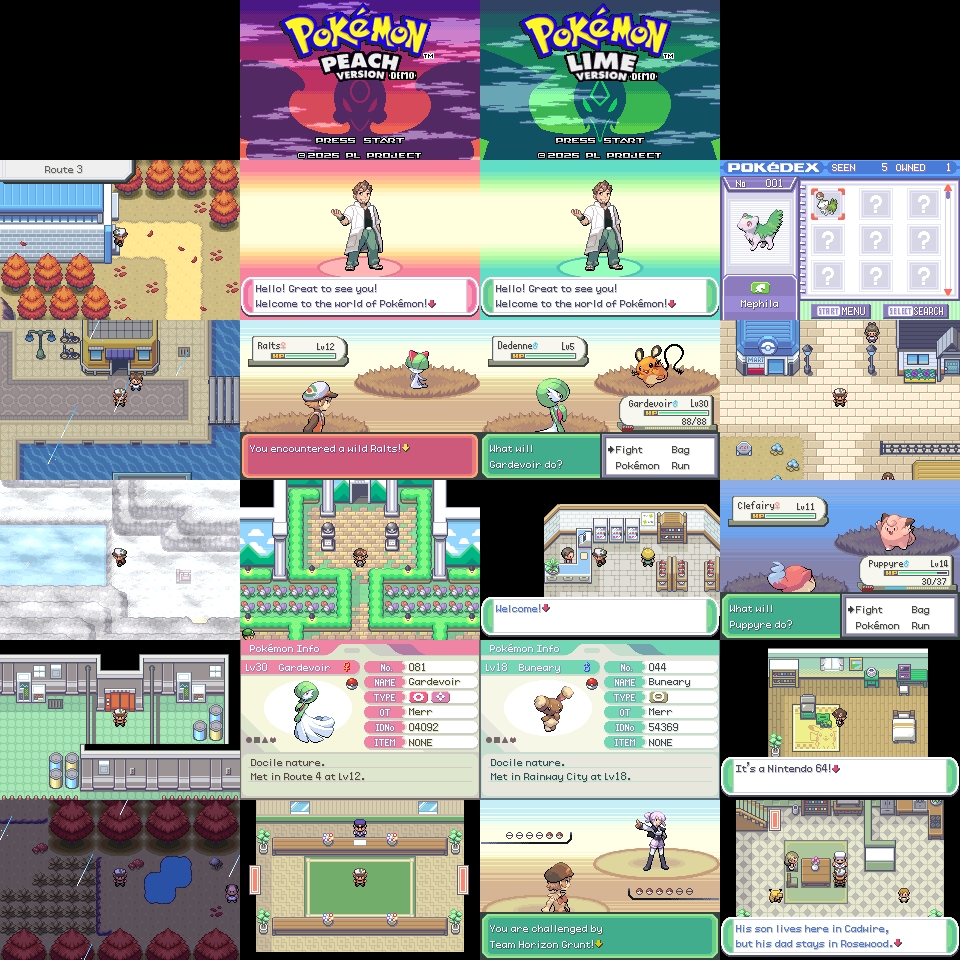 Welcome to the Celto Region, the setting for Pokemon Peach and Lime, which was inspired by Ireland! Our ROM hack aims to capture and replicate a familiar yet novel Gen 3 experience. You will travel through Celto accomplishing the gym challenge, meeting diverse personalities, and experiencing all four seasons along the way. Some will help you on your journey, while others may block your path to the top! However, trouble appears to be brewing in the background. A nefarious crew is attempting to destroy the gym challenge, but what is their goal? Every trainer has goals and dreams, but failure and sorrow are also frequent in Pokemon. So, what are you waiting for? Celto is waiting for you, so pack your bags and prepare to embark on your brand new journey!