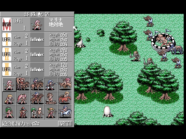 Shangrlia 2 (シャングリア2) is an Adult Turn-based Tactical/Strategy video game published by Elf and developed by ELF released on September 30th, 1993 for the PC-98. The goal of the game is to capture castles occupied by the enemy, freeing commanders on the way. Unlike in the first game, the player is no longer allowed to choose any battle right from the beginning and is at first restricted to only three battles. Same applies to characters and unit types: in the beginning the player can only control three types of fighters, and other characters are unlocked gradually. Winning battles gradually unlocks erotic pictures of the female generals. The sexual content is noticeably heavier than in the first game and includes non-traditional types of sex as well.