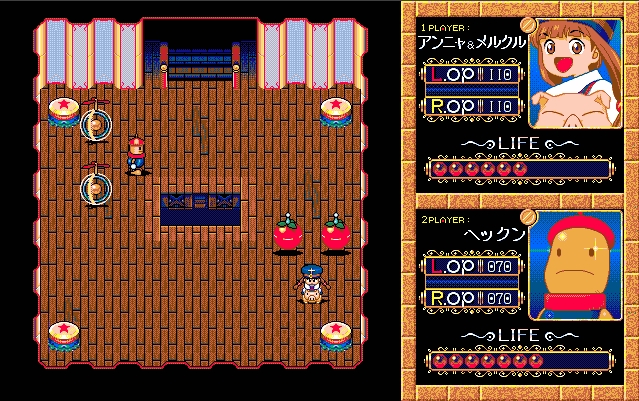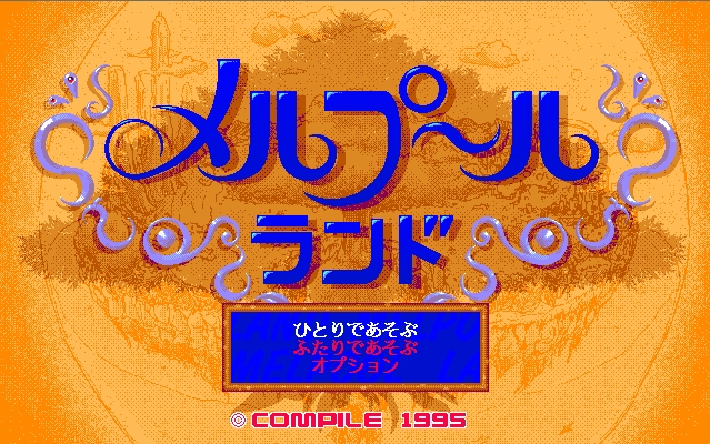 Melpool Land (メルプールランド) is an Actionl video game published by Compile and developed by Compile released on may 29th, 1991 for the PC-98. This is essentially an overhead fighting game between two characters in a small area. Each of the five characters is armed with two objects that they can use to hit their opponent or block attacks as if they were boxing gloves. The first player to reach three wins is the victor and it's possible to win by either emptying the opponent's life meter or by knocking them out of the stage. It is also possible to destroy the opponent's means of attack since they have their own health meters, leaving the opponent unable to do anything except try to ram their opponent off the stage. Arenas have holes and traps to look out for, such as bumpers and tiles that damage you, but there are no items or other abilities available. The story of the game is framed around a tournament hosted by a goddess that offers the winner anything they desire. Each character gets their own ending if you can complete the single player mode with them. A local multiplayer option is also available for two players.