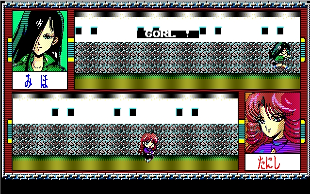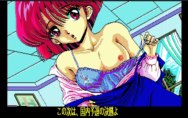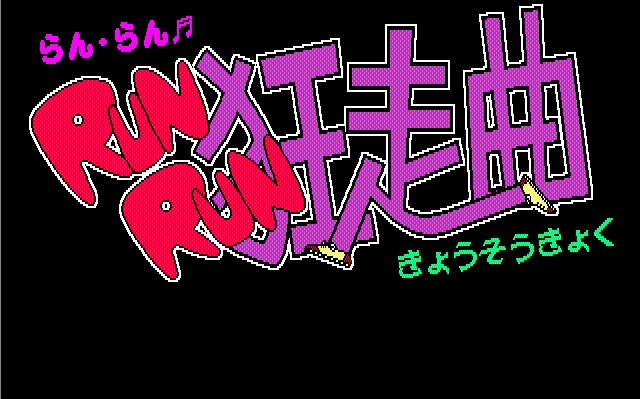 Run Run Concerto (ルンルン協奏曲) is an Adult Action/Racing video game published by Elf and developed by Elf released on September 15th, 1989 for the PC-98. This is an arcade-style on-foot racing game. It uses a split-screen side-scrolling view and can be player against computer-controlled opponents or in a two-player mode. The latter allows players to choose any stage, while the former follows a linear set of levels, starting in Tokyo and advancing to the USA via China and Europe. The courses typically feature platforming sections alongside flat terrain; it is usually required to jump in a timed fashion to succeed, and jumps can vary in height and length depending on how long the player holds the correspondent key. Runners would also take falling damage in certain spots. Each stage consists of the three races. If the player loses one but wins the other two, a mildly explicit erotic picture of a generic girl corresponding to the stage's country is shown. Should the player win the first two races two more explicit images are shown.