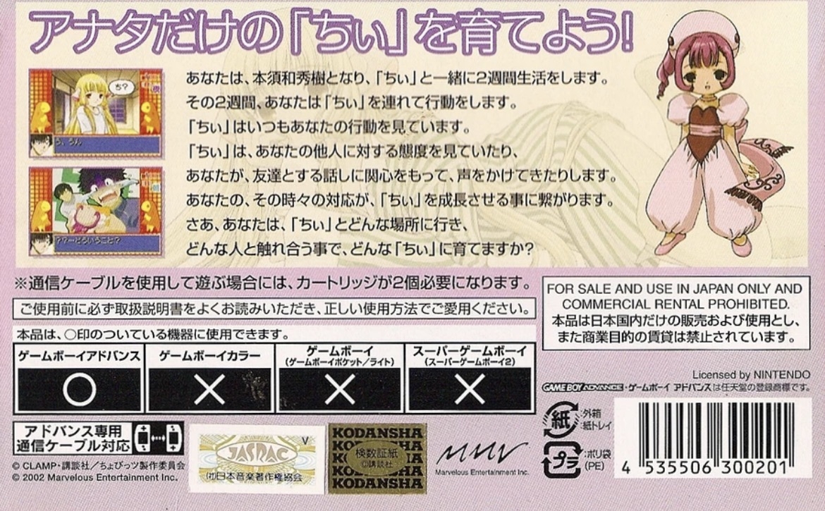 Chobits for GambeboyAdvance -Atashi Dake no Hito- (ちょびっツ for GameboyAdvance -アタシだけのヒト-, Chobits for Game Boy Advance -The Person Just For Me-) is a video game that was released exclusivity in Japan for the Game Boy Advance on September 27th, 2002. Hideki Motosuwa, a student who finds an abandoned, memory-free android named Chi. The gameplay focuses on guiding Chi’s development, teaching her, and navigating daily life over two weeks, featuring 2D visuals and text-heavy narrative scenes.