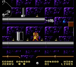 The player controls Jerry, who must navigate several levels of a house to rescue his ward Tuffy from a cage in the attic, where Tom has locked him. The game is divided into five worlds set in different locations of the house, with three stages each. After working his way through each obstacle-ridden stage, Jerry and Tom face off in a fight at the end of each world (resulting in five fights in total). Jerry has an unlimited supply of marbles to throw at enemies, although he can also use limited weapons including a hammer, bubble gum, a drill, and a cleaver, amongst others. These enemies are unique and challenging; they will respawn almost immediately after they are killed, once the screen has scrolled into a new area. The game has a total of five soundtracks, all of which were arranged by Geoff Folin, based on Scott Bradley's compositions for the original Hanna-Barbera shorts.