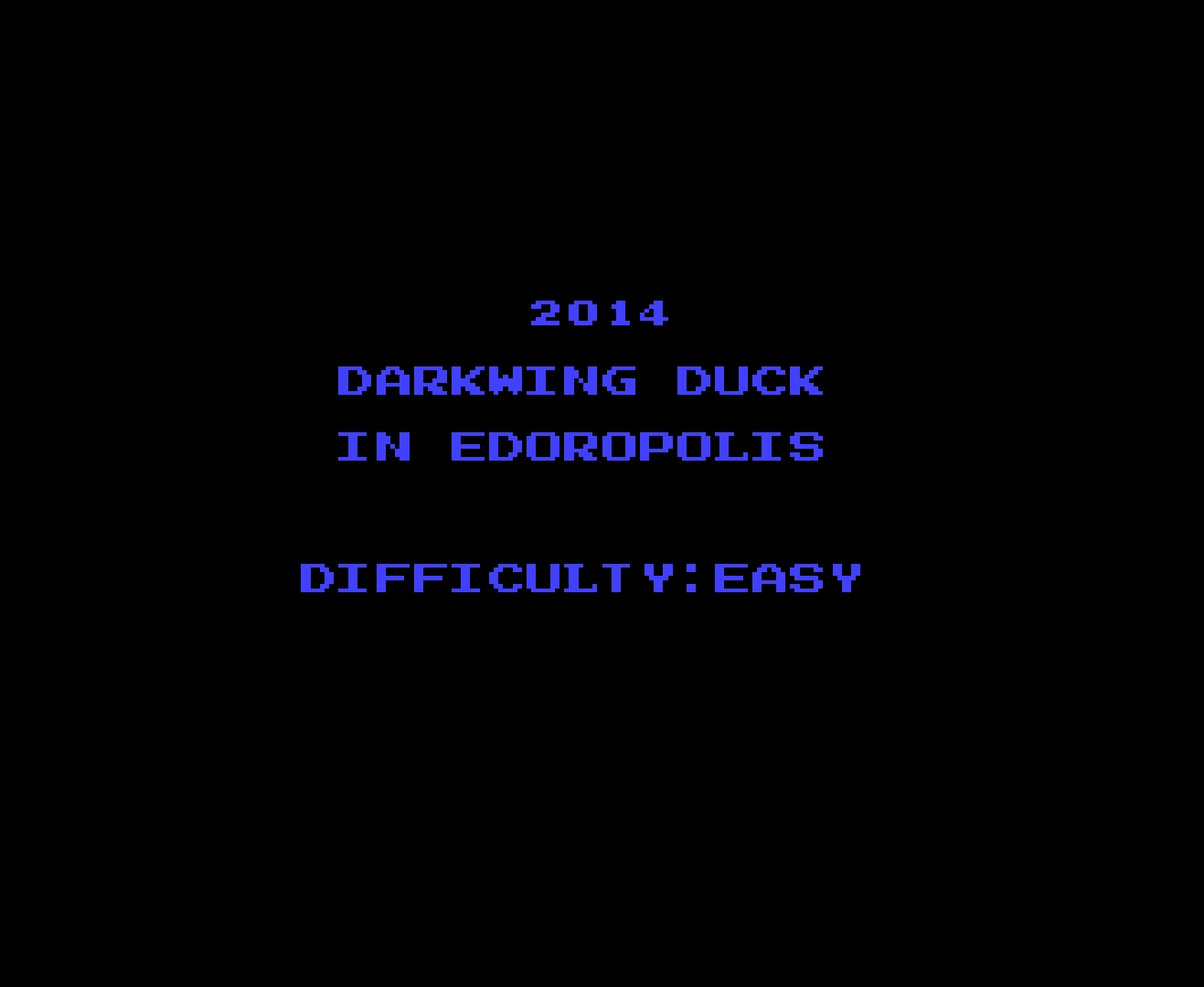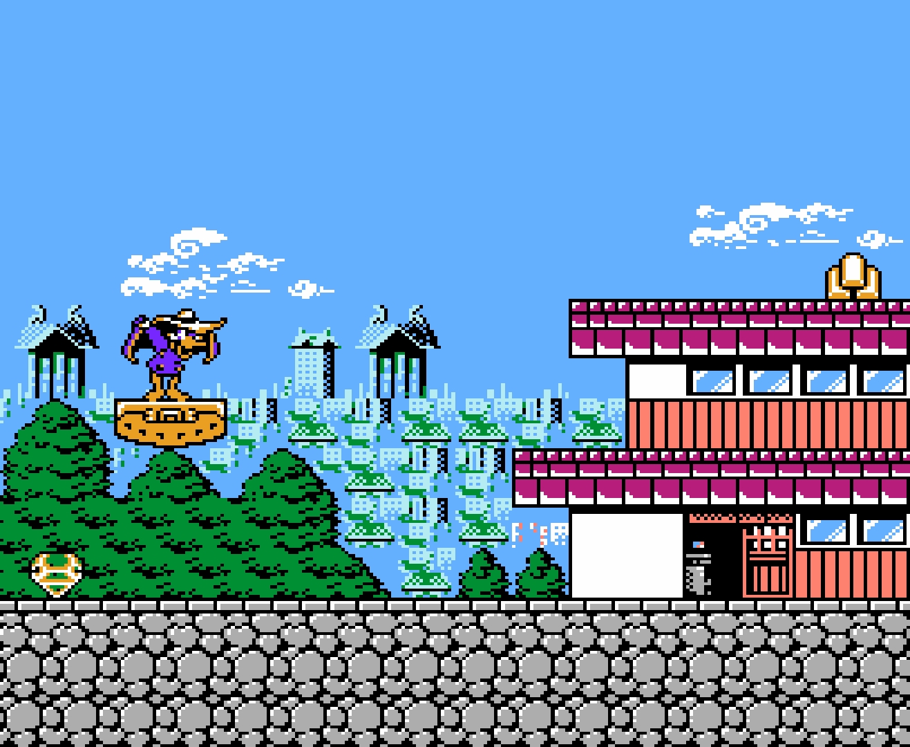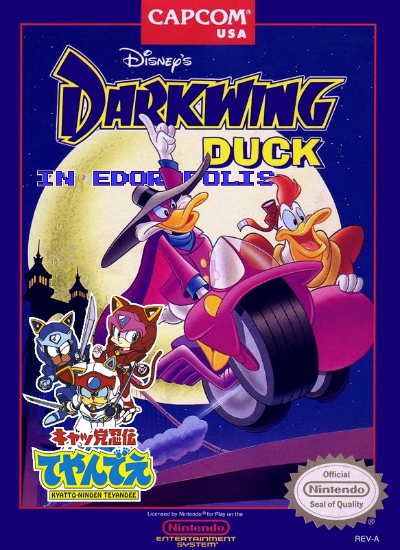 Darkwing Duck in Edoropolis is a rom hack of Darkwing Duck developed by Lomax / Emsi D in 2014 for the NES. In this hack Darkwing Duck visits a different video game known as "Samurai Pizza Cats," (a.k.a Kyatto Ninden Teyandee) where he will traverse new levels in a city known as Edoropolis. In addition to the 7 levels of Samurai Pizza Cats (recreated as accurately as possible), this hack changes almost all music in the game, includes a new weapon which after obtained can be switched with the Select button, new cut-scenes, and new and tougher bosses.