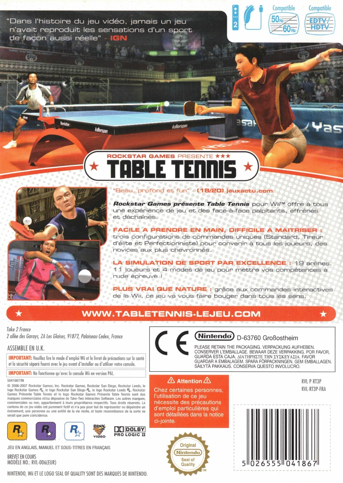Rockstar Games Presents Table Tennis is a realistic sports simulation that focuses on precision, timing, and spin-based gameplay. Players compete in singles matches across a variety of international venues, using a wide range of offensive and defensive techniques such as topspin, backspin, smashes, and lobs to outmaneuver their opponents. The Wii version introduces motion-based controls that allow players to swing the Wii Remote like a real paddle, providing a more physical and immersive approach to gameplay. Success depends on positioning, shot selection, and rally management rather than arcade-style mechanics. The game features multiple difficulty levels, tournament play, and both single player and local multiplayer modes, offering a grounded and competitive table tennis experience.