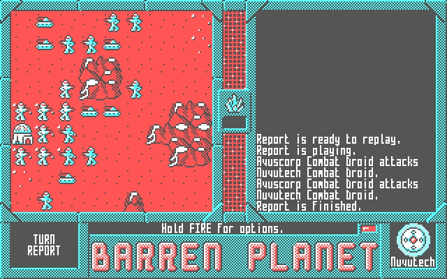 Barren Planet is a turn-based strategy game for DOS using CGA graphics mode released in 2023 by Damian Gareth Walker. Players take on the role of a strategist, controlling a number of units that move around on a battle map, attacking their enemies in an attempt to control strategic locations or to wipe their opponents out altogether. A series of battles is linked together to form the full campaign, with the outcome of one battle determining what battle is fought next. Two expansion campaigns exist "The Polar Expedition" and "Waterworld". The game can be played by one player or two. A single player can choose which corporation to work for, with the computer taking control of the opposing side. Two players can play in hotseat mode, taking turns at the same computer, or in PBM (play-by-mail) mode, sending game turns to one another using disks or electronic mail.