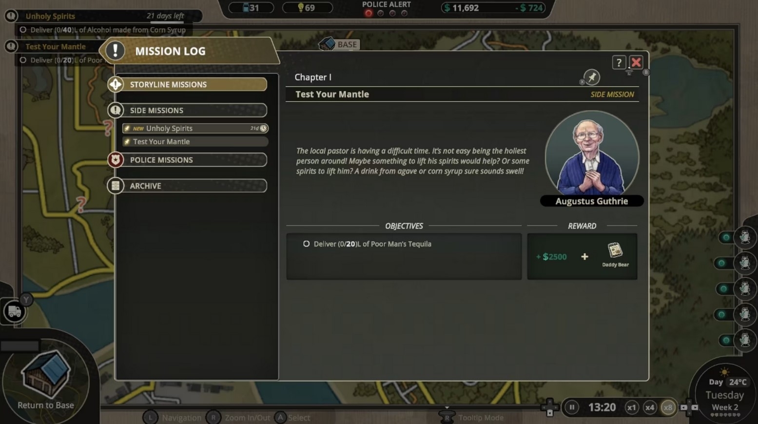 Ain't nothin’ illegal ‘til you get caught! BEGIN WITH PASSION FOR MOONSHINE We love moonshin’. There ain’t nothin’ better than good booze. In Appalachia, we know it well. We’ve got moonshine in our blood - in the case of some old-timers, maybe even literally. We love to talk about likker, make it, drink it all day long - and we love to share it too! How 'bout that, my gaming friend? GET THE KNOW-HOW AND CRAFT FINE LIKKERS What’s your alcohol of choice? Do you maybe know how to make it? The process is a complex one, but with our know-how, we can shed some light on it, if you’d like; a little bit of moonlight - moonshine! - to guide you through the processes of fermentation, distillation, and bottling. RUN YOUR BASE SMART... AND BE DISCREET Makin’ booze is pure fun, but if you’re makin’ money too - now that’s the way to live. However, for that, you need to be smart, manage your base right, and not piss off the boys in blue... We tried to capture the life of a moonshiner as realistically as possible. You’ll be managing workers who’ll be crafting and maintaining your equipment, you’ll be buying ingredients, unlocking technologies, planning deliveries and finances, making sure you remain as discreet as possible - and deciding whom to trust and with whom to work. TAKE YOUR STORY TO METROPOLIS In our game, you take on the role of a young moonshiner. You will progress through main missions, you’ll be performing side quests, and running into road events during deliveries - the life of a moonshiner is ever-exciting and full of surprises... If you’ll be prospering, you’ll get the chance to create and manage bases in five different regions, each with its own, more and more challenging missions. From your hometown mountains, through the thicket of a forest and mud of a swamp, all the way to civilization to conquer the big city. How the story will end depends purely on you - there’ll be a pesky agent who’ll want to work with you, and there’ll be a corrupt governor that you can join. But you can also ignore them. You’re a free man, after all. That’s how Moonshine Inc. came to be. Made for moonshiners, amateurs, dreamers, and newbies. Sit down, launch the game, enjoy crafting and running your business, and relax… after all, ain't nothin’ illegal ‘til you get caught!