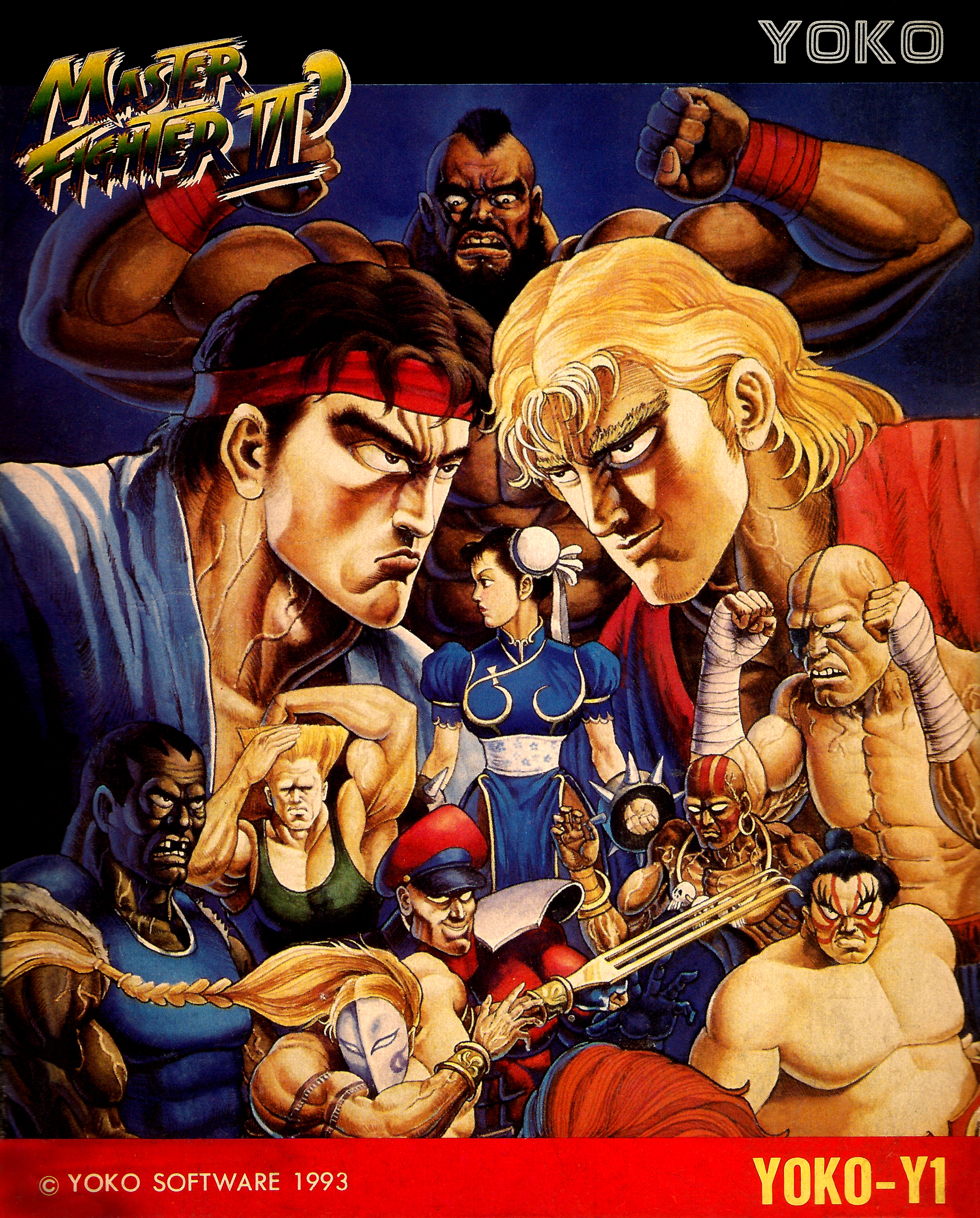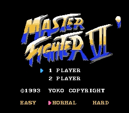 Master Fighter VI' is a port of the Street Fighter II': Champion Edition to the Famicom, made by Hummer Team & published by Yoko Soft in 1993. This game is like an upgraded version of Yoko's Street Fighter II: The World Warrior port. Instead of other bootleg versions of the game, it has the whole roster from the original game along with a clone for each character (the clones having different names, changed portraits and different palettes). Some of these characters have different commands for the special moves compared to the original game. (EX: Dhalsim's spinning attacks are done by doing a back-forward motion on the ground and not holding down in the air). The game includes all the stage music from Yoko's original Street Fighter II port, being used several times for other characters. The game provides three difficulty settings, however the ending is the same on any setting -- a black screen with "congratulations" on it.The AI also seems to be easier compared to Street Fighter II. One notable thing about this game is that the graphics for most of the fighters and stages were taken from Super Fighter III, while some of them are from Yoko's Street Fighter II. E.Honda, Zangief and M.Bison (Balrog everywhere else) are in this game despite not appearing in Street Fighter III at all (however, Zangief uses his graphics from the original Street Fighter II while E.Honda and M.Bison are custom)