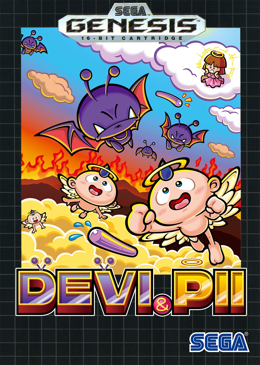 An adventure game where two characters, Taro and Hanako, have turned into paddles and are tasked with rescuing the titular angel Pii from the demon Devi while dodging the latter’s attacks. Devi & Pii, known as Devi to Pii (でびとぴー) in Japan, is an action game for the Sega Mega Drive. Though developed as early as 1992, it was never officially announced in any media during this period and remained unreleased until its inclusion as a bonus game in the Mega Drive Mini 2 in 2022.