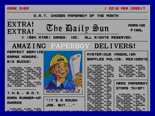 Paperboy is a 1985 arcade video game developed and released by Atari Games in the USA on April 18, 1985. The player controls a paperboy on a bicycle delivering newspapers along a suburban street which is displayed in a cabinet perspective (or oblique projection) view. The player attempts to deliver a week of daily newspapers to subscribing customers, attempts to vandalize non-subscribers' homes and must avoid hazards along the street. Subscribers are lost by missing a delivery or damaging a subscriber's house. If the player loses all of their lives, or runs out of subscribers, the game ends. The game begins with a choice of difficulty levels: Easy Street, Middle Road and Hard Way. The object of the game is to perfectly deliver papers to subscribers for an entire week and avoid crashing (which counts as one of the player's lives) before the week ends. The game lasts for seven in-game days, Monday through Sunday. Controlling the paperboy with the handlebar controls, the player attempts to deliver newspapers to subscribers. Each day begins by showing an overview of the street indicating subscribers and non-subscribers. Subscribers and non-subscribers' homes are easy to discern in the level itself, with subscribers living in brightly colored houses, and non-subscribers living in dark houses. The player scores points for each paper delivered successfully, either at a subscriber's doorstep or inside their mailbox, the latter of which awards more points, as well as breakage points by damaging the houses of non-subscribers. A perfect delivery, with all subscribers get their papers, and none of their houses are damaged, results in all the points being worth double for that day, and an extra subscriber is added. At the end of each stage is a training course with various obstacles to throw papers at which gives bonus points and to jump over, and the player scores a bonus for finishing the course. Crashing on the course ends the round, but does not cost the player a life. When a player fails to deliver a paper to a house, or damages a subscriber's house by breaking their windows, the resident will cancel their subscription, and the house turns dark. The player can regain subscribers by getting a perfect delivery, which adds one extra subscriber. The paperboy can hold no more than ten papers at once, although refills can be found throughout the level. The papers can be used to stun enemies, with the exception of cars.