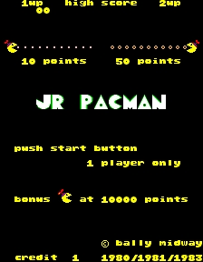 Jr. Pac-Man is a 1983 arcade video game developed by General Computer Corporation and released by Bally Midway in the USA on November 9, 1983. Jr. Pac-Man is the eighth game in the Pac-Man series and the fifth and final game in the Pac-Man series to be developed without Namco's involvement. The core gameplay of Jr. Pac-Man is similar to its predecessors. The player controls the eponymous Jr. Pac-Man (who wears an animated propeller beanie), and scores points by eating all of the dots in the maze, while four ghosts (Blinky, Pinky, Inky, and Tim, who replaces Clyde) chase him around the maze and attempt to catch him. Eating a power pellet turns the ghosts blue, briefly allowing the player to eat them for extra points. Once the maze is cleared, a new maze is presented and the gameplay continues. The mazes are now twice the width of the monitor and scroll horizontally. A total of seven mazes appear throughout the game, and five of them have six power pellets instead of four, but none of them have tunnels that wrap around from one side of the screen to the other. Bonus items (such as tricycles, kites, and balloons) appear in each round, starting above the ghosts' lair and moving around the maze as in Ms. Pac-Man. As an item encounters dots, it changes them into larger ones that award more points but slow Jr. Pac-Man down while he is eating them. After a certain length of time, the item will move toward one of the remaining power pellets (if any) and explode on contact if not eaten, destroying both itself and the pellet. Contact between Jr. Pac-Man and a non-vulnerable ghost costs the player one life and makes any large dots either disappear or revert to normal ones, depending on how many dots overall are left in the maze. The between-level intermissions show the developing relationship between Jr. Pac-Man and a small red ghost named Yum-Yum who is apparently the daughter of Blinky.