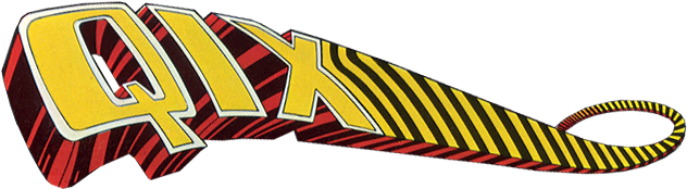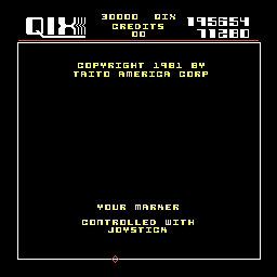 Qix is a 1981 arcade video game developed and released by Taito America in the USA on October 18, 1981. Controls consist of a four-direction joystick and two buttons: "Slow Draw" and "Fast Draw". The player controls a diamond-shaped marker that initially moves along the edges of the playfield. Holding down one of the draw buttons allows the marker to draw a line (Stix) in unclaimed territory in an attempt to create a closed shape. Once an area is captured, it is filled with color and points are awarded based on the area claimed and drawing speed. Areas captured entirely with Slow Draw (orange-red in the screenshot) are worth double. The titular Qix is a colorful geometric figure in constant and random motion. The Qix will not actively seek out the marker, and it will not harm the marker if it collides with it while the marker is traversing the edge of the playfield or of any captured area. However, if the Qix collides with the marker as it is drawing a Stix before a new area is captured (or it touches the exposed Stix), one life is lost. The marker cannot cross or backtrack along the line being drawn. If the marker stops while drawing, a fuse appears and burns along the line toward the marker; if it reaches the marker, the player loses one life. The fuse disappears once the marker is moved. If the player draws into a position where it cannot proceed any further, the fuse is triggered. The attract mode calls this a "Spiral Death Trap". Sparx are enemies that traverse all playfield edges except unfinished Stix. A life is lost if one hits the marker. A meter at the top of the screen counts down to the release of additional Sparx and the mutation of all Sparx into Super Sparx, which can chase the marker along uncompleted Stix. To complete a level, the player must claim a 75% percentage of the playfield (adjustable to be between 50% and 90%). If a level is completed by exceeding the minimum area percentage, a bonus is awarded for every 1% beyond the threshold. Starting in level three, the player faces two Qixes. Splitting the playfield into two regions, each containing one Qix, ends the level. No immediate bonus is awarded for this, but a bonus multiplier is applied to the scoring in all subsequent levels. This multiplier starts at one before the first time that the Qix are split and increases by one for every additional splitting of the Qix, to a maximum of nine. Levels also add additional Sparx and the eventual appearance of only Super Sparx.
