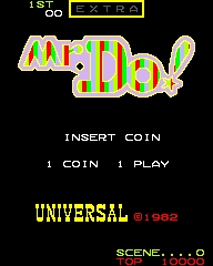 Mr. Do! is a 1982 arcade video game developed by Universal and released by Universal USA in the USA on December 4, 1982. Mr. Do! is the first video game in the Mr. Do! series. The object of Mr. Do! is to score as many points as possible by digging tunnels through the ground and collecting cherries. The title character, Mr. Do (a circus clown—except for the original Japanese version of the game, in which he is a snowman), is constantly chased by red dinosaur-like monsters called creeps, and the player loses a life if Mr. Do is caught by one. The game ends when the last life is lost. Cherries are distributed throughout the level in groups of eight, and collecting all the cherries in one group without a pause awards bonus points. A level is complete either when all cherries are removed, all creeps are destroyed, "EXTRA" is spelled, or a diamond is found. Mr. Do can defeat creeps by hitting them with his bouncing "power ball" or by dropping large apples on them. While the power ball is bouncing toward a creep, Mr. Do is defenseless. If the ball bounces into an area where there are no creeps to hit (such as behind a fallen apple), Mr. Do cannot use it again until he has retrieved it. When the power ball hits a creep, it then reforms in Mr. Do's hands after a delay that increases with each use. Mr. Do or the creeps can push an apple off the edge of a vertical tunnel and crush one or more creeps. If an apple falls more than its own height, it breaks and disappears. Mr. Do can also be crushed by a falling apple, causing a loss of life. Occasionally, the creeps transform briefly into more powerful multicolored monsters that can tunnel through the ground. If one of these digs through a cherry, it leaves fewer cherries for Mr. Do to collect. When it digs under an apple, it often crushes itself, other creeps, and/or Mr. Do. As the game progresses, a display at the top of the screen cycles through the letters in the word EXTRA. Every time the player's score reaches a multiple of 5,000 points, the highlighted letter enters the playfield as an Alphamonster, which can be defeated in the same manner as a creep. Defeating the Alphamonster awards its letter; collecting all five letters ends the level, plays a cut scene accompanied by the theme to Astro Boy, and awards the player an extra life. Alphamonsters attempt to eat any apples they encounter, which makes them difficult to crush. The creeps spawn at the center of the screen. After they have all appeared, the generator will turn into a food item; picking this up scores bonus points, freezes all the creeps, and calls out an Alphamonster (if one is not already on the field) and three large blue monsters. The latter can eat apples as well. The creeps stay frozen until the player either defeats all three blue monsters, defeats the Alphamonster (in which case any remaining blue monsters are turned into apples), loses a life, or completes the stage. Rarely, dropping an apple reveals a diamond which, if collected, completes the level and awards a bonus credit to the player.