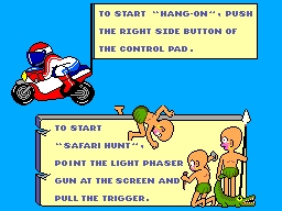 Hang-On & Safari Hunt is a 1986 Master System video game developed by Sega R&D2 and released by Sega of America in the USA on September 1, 1986. Motorcycle racing and jungle adventure - all in one Sega Combo Cartridge. Two great games. One combo cartridge. Hang-On is the 3D motorcycle race game that's taken the arcades by storm. Race through grasslands, sea sides, valleys, nighttime cityscapes, and of course, motorcycle race courses. This game is so fast it even gives you special racing techniques like hang-on and countersteering for taking the corners. Safari Hunt is the most complete jungle game ever created. Scramble through thick forests. Jump over gulping bogs. And watch out for the alligators. Because they're watching out for you.