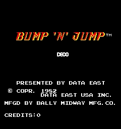 Bump 'n' Jump is a 1983 arcade video game developed by Data East and released by Bally Midway in the USA on February 18, 1983. The enemy vehicles are cars and trucks. Cars can be bumped into obstacles or jumped upon and destroyed, while trucks cannot be bumped; they can only be jumped upon to destroy them, and will sometimes drop obstacles that will destroy the player or one extra life. At the end of each level players receive bonus points for the number of enemy vehicles crashed. Going from one level to another is characterized by a change of seasons. Players get points for bumping other cars and causing the other cars to crash. When a large obstacle which needs to jumped over, such as a body of water, is approaching, then the game displays a flashing exclamation point as a warning.
