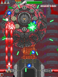 "Bullet Gun Feveron", also known as Fever SOS) is a vertical scrolling shooter game developed by Cave and published by Nihon System Inc. in 1998. The gameplay is typical of manic shooters, with numerous swarms of enemies onscreen at any given time, and bosses that shoot intimidatingly large clusters of bullets. Unique to this title, the score of the game is disco music, which is a particularly unusual choice for a shoot 'em up.