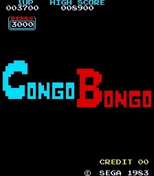 Congo Bongo is a 1983 arcade video game developed by Sega and Ikegami Tsushinki and released by Sega Enterprises Inc. in the USA on March 14, 1983. Congo Bongo has similar elements and gameplay to Nintendo's Donkey Kong from 1981, with the isometric perspective from Sega's Zaxxon released in Japan in early 1982. Both Congo Bongo and Donkey Kong involve primates who throw objects at the player from a vantage point atop a structure. Both games involve a large-nosed protagonist whose only ability is to jump. Both games have four different, single-screen stages The goal of the first stage in both games is to climb to the top. Even the graphics of the bonus timer are similar to Donkey Kong's. Stages In the first stage, the hunter must avoid coconuts thrown by Bongo and he has to climb a series of cliffs to reach the ape, while at the same time shaking off three monkeys that try to throw the hunter off the mountain. In the second stage, the hunter must cross a swamp platform by riding on the backs of diving and swimming hippopotamuses and avoiding both poisonous snakes and scorpions. The third stage requires the hunter to cross a plain and crouch into holes to evade the horns of charging rhinoceroses, while climbing up large flights of stairs to proceed to the next area. In the fourth and final stage, the hunter crosses a second swamp that with lily pads, fish, and hippos, to reach a gate of charging rhinos that are blocking the entrance to Bongo in a hot tub. The game repeats from the first level with increased difficulty.
