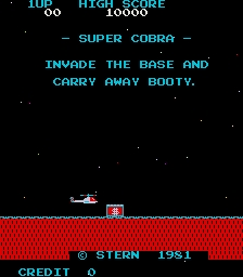 Super Cobra is a 1981 arcade video game developed by Konami and released by Stern Electronics in the USA on June 22, 1981. Super Cobra is the sequel to the 1981 arcade video game, Scramble. The player controls a helicopter through tight caverns, and the slightest misstep will result in the loss of a life. However, unlike Scramble, the game can be continued where the player left off by adding more credits and pressing FIRE (but he/she loses all points upon continuing). The joystick accelerates, decelerates, moves up, and moves down. The helicopter uses a laser and bomb to destroy defenders, tanks, and UFOs while infiltrating 10 Super Cobra defense systems. The ship has a limited fuel supply, which is depleted over time. More fuel can be acquired by destroying fuel tanks in the game. The game is divided into ten sections, plus a finale, each with a different style of terrain and different obstacles. Players navigate through ten levels and a base, where they must safely make it through the level and remove the booty. The levels are described as follows: Player must maneuver the chopper over mountainous terrain against fast and slow firing rockets. Chopper faces Arcing missiles over a mountain terrain. Smart Bombs flying in groups of four over mountainous terrain. Rockets appear, but do not fire. Single Smart Bombs over mountainous terrain. Again, Rockets appear, but do not fire. Chopper flies through a cavern-like terrain against falling mines. Rapidly firing, roving tanks over mountainous terrain. Rockets appear, but do not fire. Maneuver through a field of meteors which explode when hit with bombs or 3 times with laser, plus a single, green, shadow meteor directly in front of chopper which explodes when hit five times with laser. Rockets appear but do not fire. Chopper flies over mountainous terrain against rapidly firing UFOs. Tanks and rockets appear, but do not fire. Chopper faces arcing missiles over tall buildings. Firing rockets in a building maze. Base: Player must maneuver the chopper over tall buildings against arcing missiles and rapidly firing tanks to reach the Booty and safely carry it away. If the mission is successful, an extra copter is given (plus one when 10,000 points are scored). There is no intermission between each section; the game simply scrolls into the new terrain. If the player destroys the booty on the final level, he/she must start back at the beginning of the level. If the booty is safely carried away, the player starts back at the beginning of the first level and the cycle repeats. On the second time through the levels, the tanks fire much more aggressively and fuel is consumed much faster. On the third and subsequent times through the levels, fuel is consumed still faster. The faster rate of fuel consumption on the second and subsequent cycles may make it difficult to complete those cycles without losing at least one chopper due to running out of fuel, although this is compensated somewhat by awarding an extra chopper each time a cycle is completed and the booty is carried away.