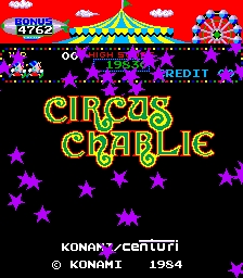 Circus Charlie is a 1984 arcade video game developed by Konami and released by Centuri in the USA on March 1, 1984. There are six regular stages (plus an extra stage) of differing tasks that are to be completed by Charlie. Grabbing money bags, performing dangerous tricks, avoiding enemies, completing stages, etc., earns Charlie points. After the sixth stage is completed, the game starts over again but with a faster pace and more difficult (but exactly the same in terms of task to be completed) levels. Charlie also races against time. Bonus points are awarded according to the time remaining, but running out of time will cost the player a life. Levels The standard Arcade version has 6 levels in total. Levels 1, 2, 4 and 5 have 5 sublevels. Level 3 contains 7 sublevels. Each sublevel gets more difficult. Level 6 also has 5 sublevels, but repeats as long the user has lives. Level 1: Ride on a lion and jump through flaming rings. Level 2: Tightrope walking whilst jumping over monkeys. Level 3: Jump between trampolines and beware the knife throwers and fire breathers. In sublevel 3 and 6 the trampolines are placed in a swimming pool and the knife throwers and fire breathers are replaced by jumping dolphins. Level 4: Jump from ball to ball. Level 5: Ride a horse and jump over trampolines and walls. Level 6: Swing from one trapeze to the next.