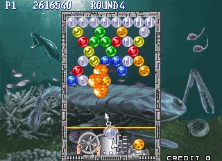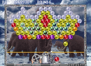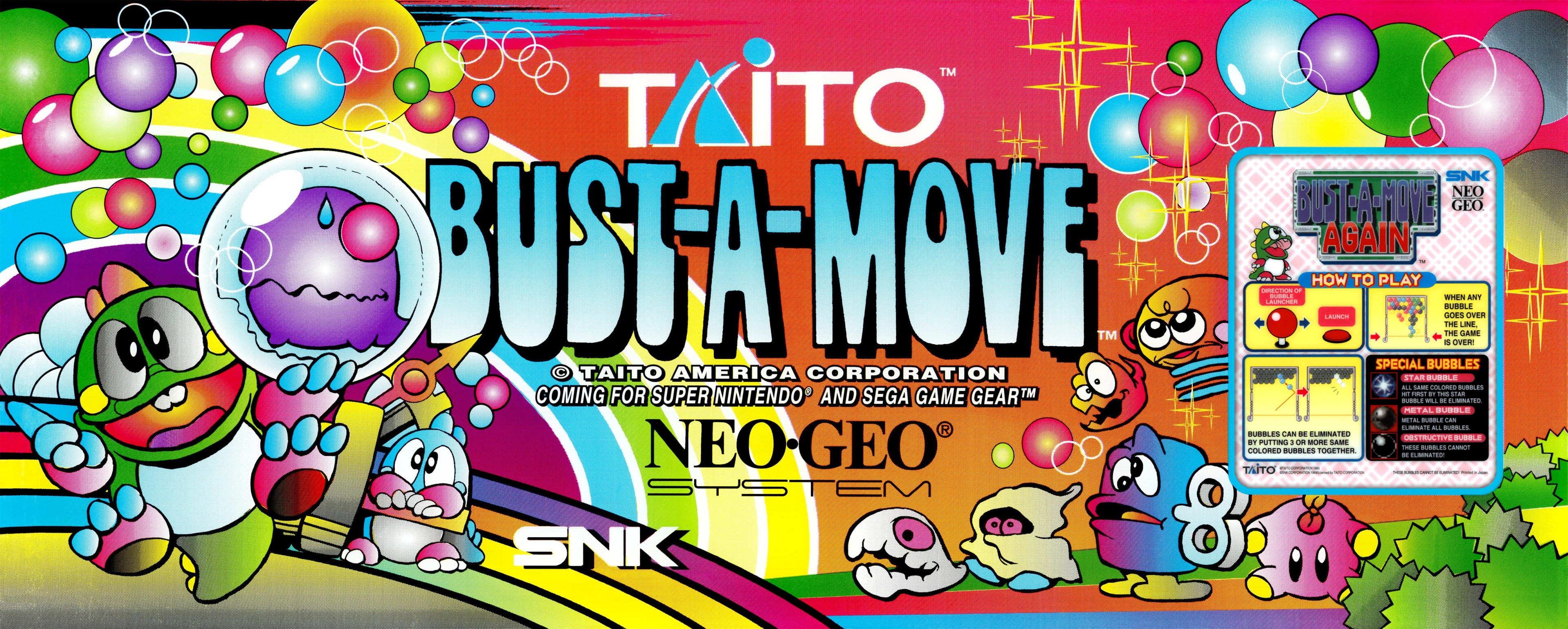Puzzle Bobble 2 is the first sequel to "Puzzle Bobble". It was entitled in Europe and North America as Bust-A-Move Again on the arcade and Bust-A-Move 2 on the home consoles. Released into the arcades in 1995, PlayStation, Sega Saturn, Nintendo 64 and PC conversions followed. The game was included in Taito Legends 2, but the US arcade version was included on US PS2 version instead. The game is a spin-off from Bubble Bobble. The game builds on the original by adding a tournament style variation on the two player game for play against the computer and by adding a branching map to the one player game, allowing the player to periodically select one of two groups of five levels to play next, leading to different game endings. Some of the contestants in the new tournament mode are based on characters from Bubble Bobble, including variations on a Monsta and a Mighta. Some versions of the game, including the PlayStation, feature time trial competitions in which a single player attempts to finish simple rounds quickly enough to beat previous time records or two players simultaneously attempt to beat the records and each other. Completion of the single player game gives the player a code which can be entered to unlock 'Another World' for the single player game, which features subtle changes to the existing levels to increase their difficulty and changes to all backdrops to resemble levels from Bubble Bobble. The various enemies from Bubble Bobble also make an appearance in the background of the credits sequence.