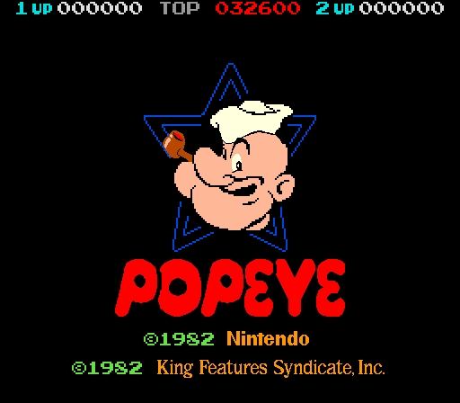 Popeye is a 1982 arcade video game developed by Nintendo R&D1 and released by Nintendo of America in the USA on November 18, 1982. It is based on the comic series, Popeye, which was produced by King Features Syndicate. The object of the game is for Popeye to collect a certain number of items dropped by Olive Oyl, depending on the level — 24 hearts, 16 musical notes, or 24 letters in the word HELP — while avoiding the Sea Hag, Brutus and other dangers. The player can make Popeye walk back and forth and up and down stairs and ladders with a 4-way joystick. There is a punch button, but unlike similar games of the period, no jump button. Conversely, Brutus can jump down a level and also jump up to hit Popeye if he is directly above. Despite the feature of a punch button, Popeye cannot attack Brutus directly. Instead, the button is used for the following: Punching destroys items that could hurt Popeye such as bottles, vultures and skulls. Each level has a can of spinach; punching these cans will give Popeye invincibility and he can knock out Brutus just by running into him, although after a few seconds Brutus will swim back out and be ready for action again. In Round 1 (the dock scene) of each three-round cycle is a punching bag, which Popeye can use to knock loose a nearby barrel from its position near the top of the playing field. If the barrel falls onto Brutus' head, the player earns bonus points (based on where Brutus was attacked) and renders Brutus harmless for several seconds. Other licensed Popeye characters in the game are Olive Oyl, Swee'Pea, and Wimpy, though they are mostly decorative and do not add heavily to the gameplay. Wimpy appears in Round 2 (the street scene) on one end of the seesaw in the lower left corner of the field, to act as a counterweight. Swee'Pea floats high above, with bonus points to be earned if Popeye can spring off the see-saw and touch him. Popeye loses a life if he is hit by Brutus or any thrown/flying object, or if he fails to catch a dropped item before it reaches the bottom of the screen.